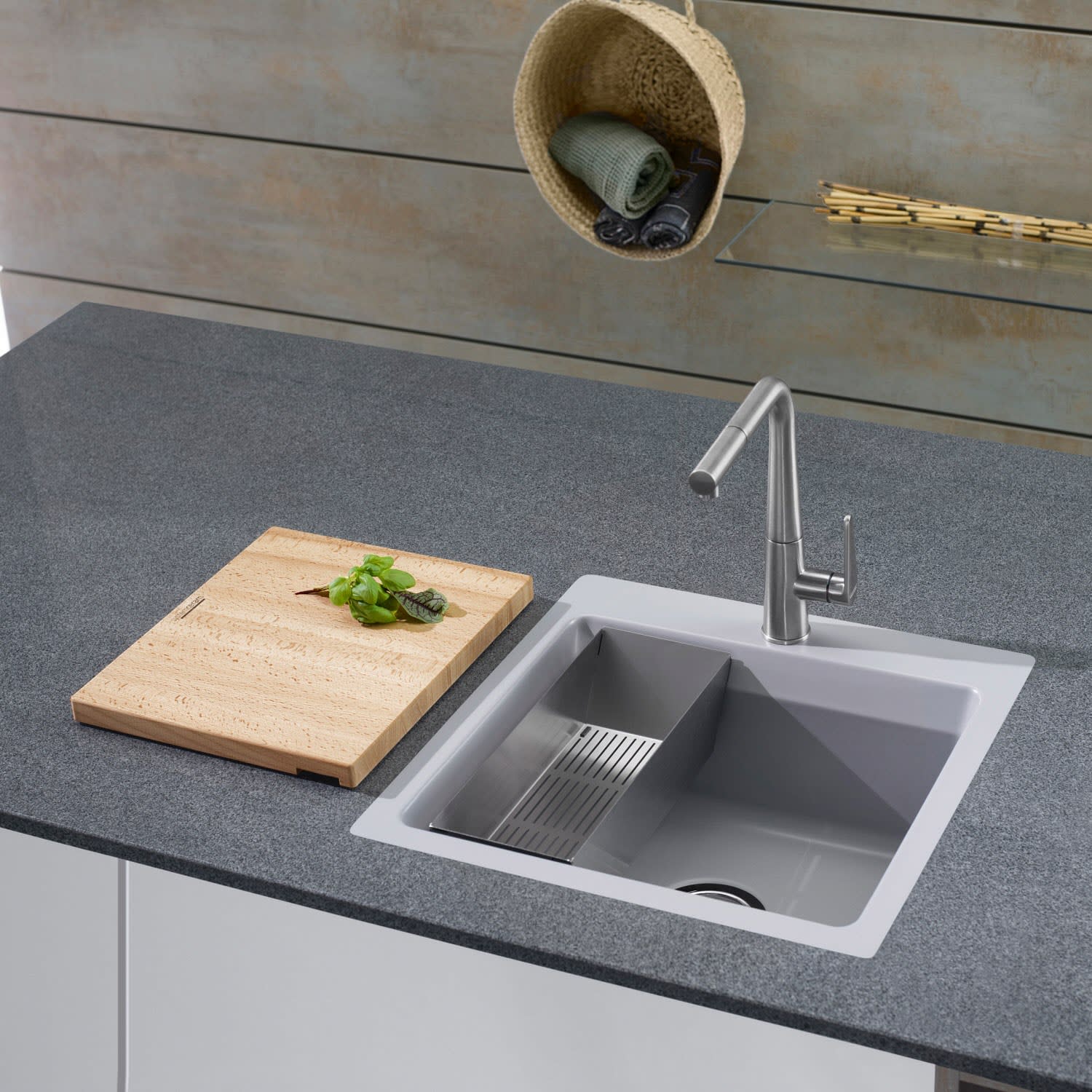 Unsere flächenbündigen Varianten haben Hochkonjunktur. Auch die Kara 51 F macht hier keine Ausnahme. Mehr fürs Auge, mehr für die Küche bietet die "gegen Null auslaufende", fast übergangslose Abtropffläche der Kara 51 F. Die angeschrägten Beckenkanten nehmen die MedioMatte als zweite Funktionsebene im Becken auf. Mittig platziert entsteht dabei eine optische Fortsetzung der markanten Rillen auf der praktischen Abtropftfläche.