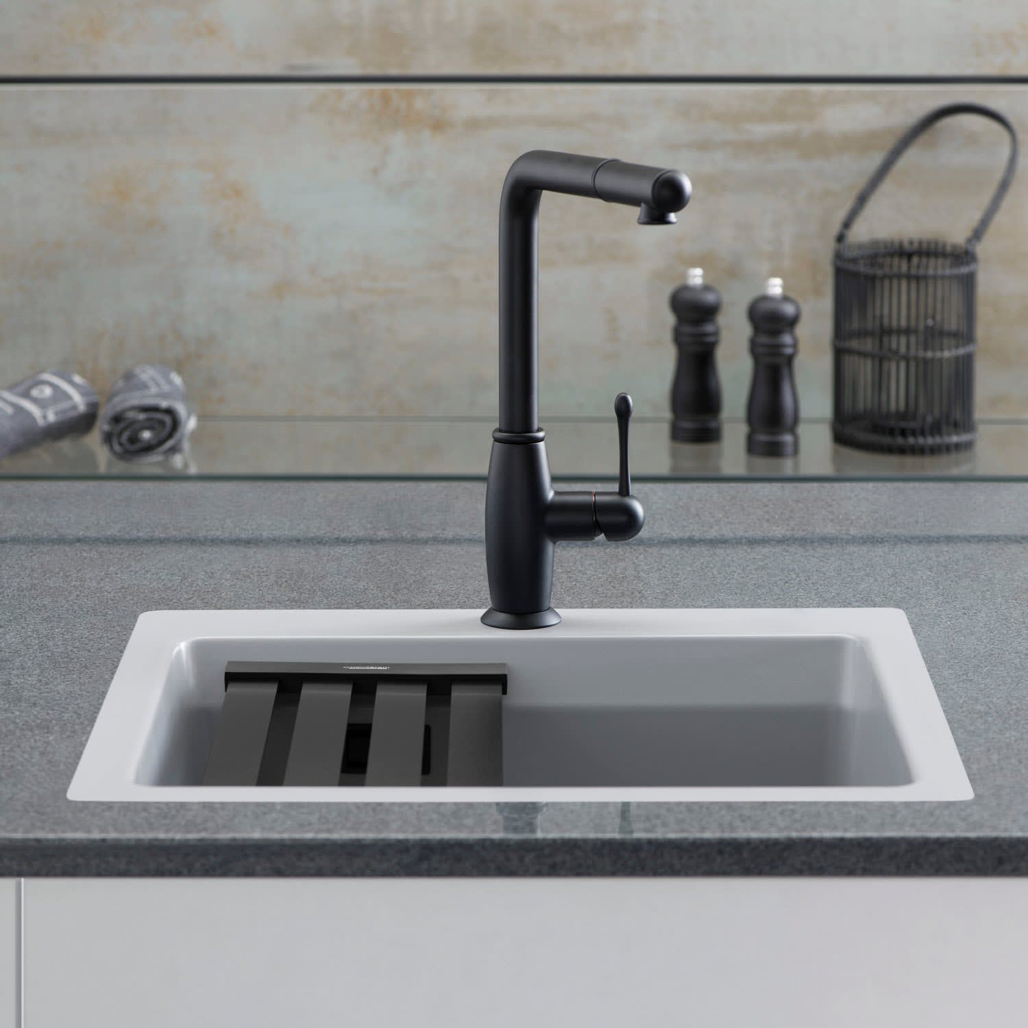 Unsere flächenbündigen Varianten haben Hochkonjunktur. Auch die Kara 51 F macht hier keine Ausnahme. Mehr fürs Auge, mehr für die Küche bietet die "gegen Null auslaufende", fast übergangslose Abtropffläche der Kara 51 F. Die angeschrägten Beckenkanten nehmen die MedioMatte als zweite Funktionsebene im Becken auf. Mittig platziert entsteht dabei eine optische Fortsetzung der markanten Rillen auf der praktischen Abtropftfläche.
