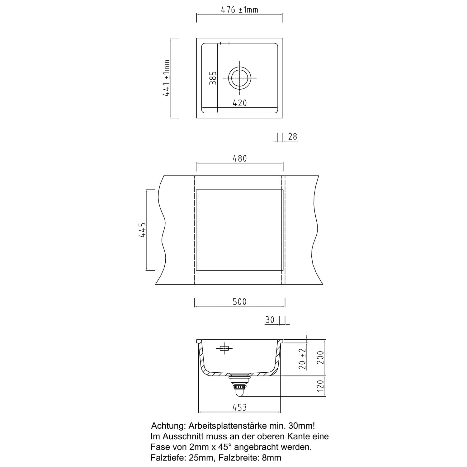 - Ausschnittmaß in der Arbeitsplatte: Breite 48 x Tiefe 44,5 cm