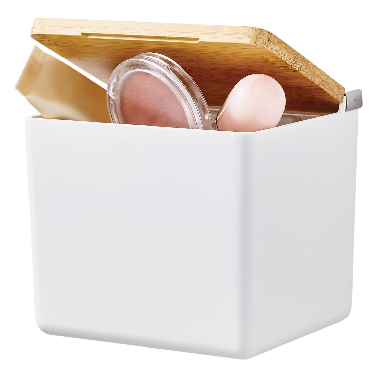 Clevere Organisation kleiner Utensilien: Die Box mit tiefer Form eignet sich für Dinge wie Schmuck, Haargummis oder Wattepads - der Bambus-Deckel ist Verschluss und optisches Highlight zugleich. Mit feuchtraumbeständiger, leistungsstarker Klebetechnologie: Abgestimmt auf feuchte Bereiche wie das Bad, hält die Ablage mit einer Haltekraft von 3 kg auch bei Kontakt mit Wasser zuverlässig.