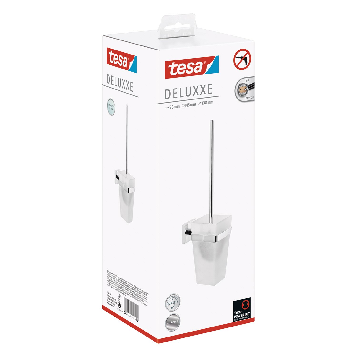 und verchromtes Metall als harmonisches Duo: WC-Bürstengarnitur mit Wandhalterung, und WC-Bürste - zeitgemäß kantige Form, die im Bad. Keine Schäden - empfehlenswert für Mietwohnungen, rostfrei. Unkomplizierte, saubere Wandmontage: Mit der tesa Power.Kit Technologie zur einfachen Befestigung an der Wand - ohne Bohrmaschine, ohne handwerkliche Vorkenntnisse, ohne den sonst anfallenden Schmutz