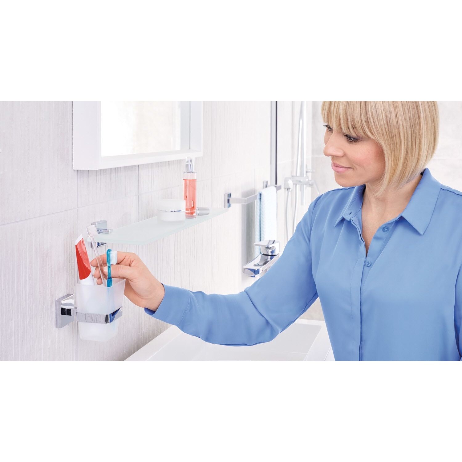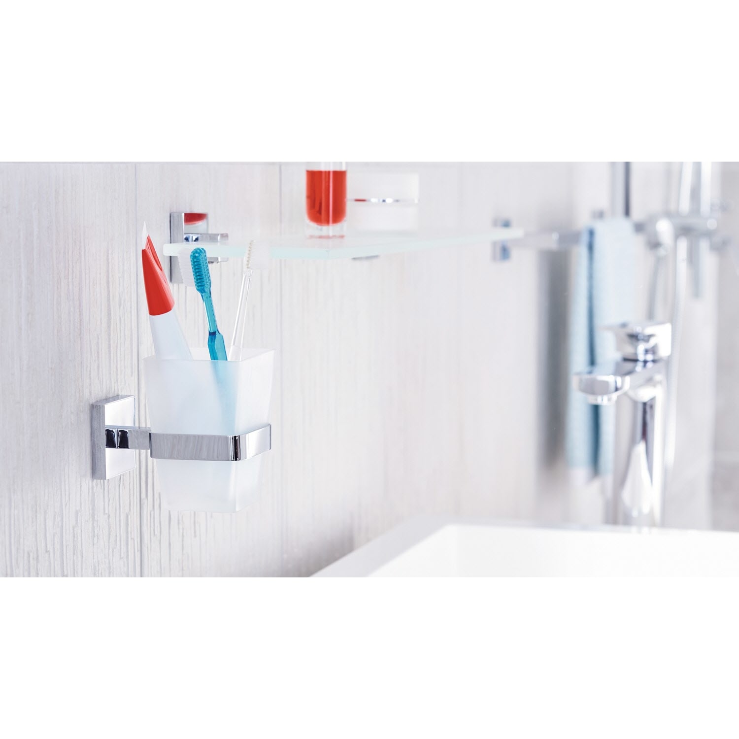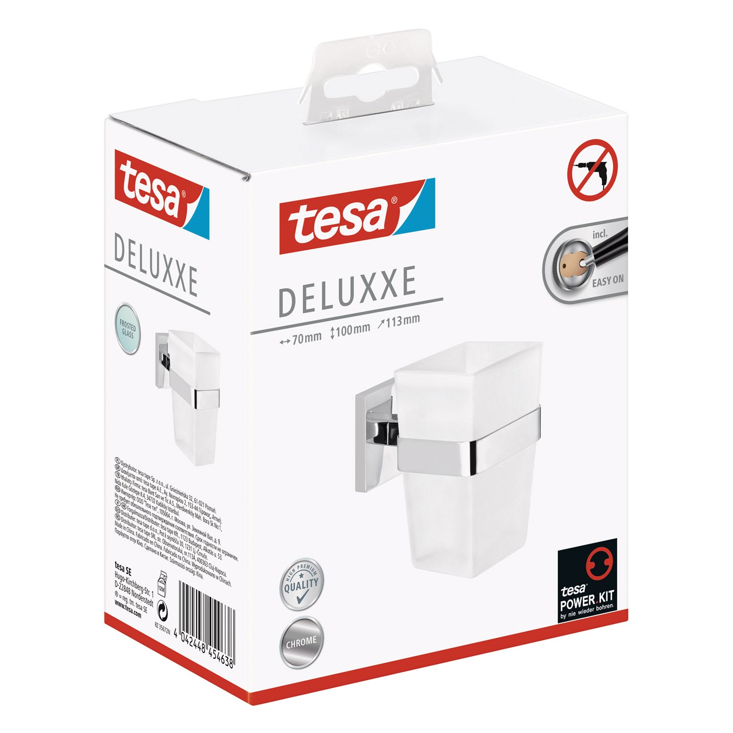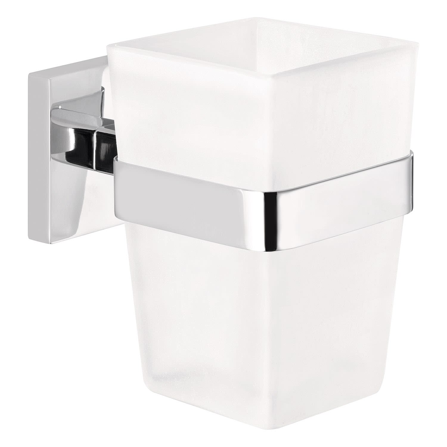 Modernes, geometrisch inspiriertes Design fürs Bad: Ein edles Accessoire zum Zähneputzen - der kantig geformte Zahnputzbecher aus Milchglas wird von einem verchromten Zahnbecherhalter umfasst. Beständige Klebetechnologie mit hervorragender Haltekraft - ohne Bohrlöcher: Der Halter für den Mundbecher hinterlässt an Wänden im Badezimmer keine Schäden - empfehlenswert für Mietwohnungen, rostfrei. Unkomplizierte, saubere Wandmontage: Mit der tesa Power.Kit Technologie zur einfachen Befestigung an der Wand - ohne Bohrmaschine, ohne handwerkliche Vorkenntnisse, ohne den sonst anfallenden Schmutz.