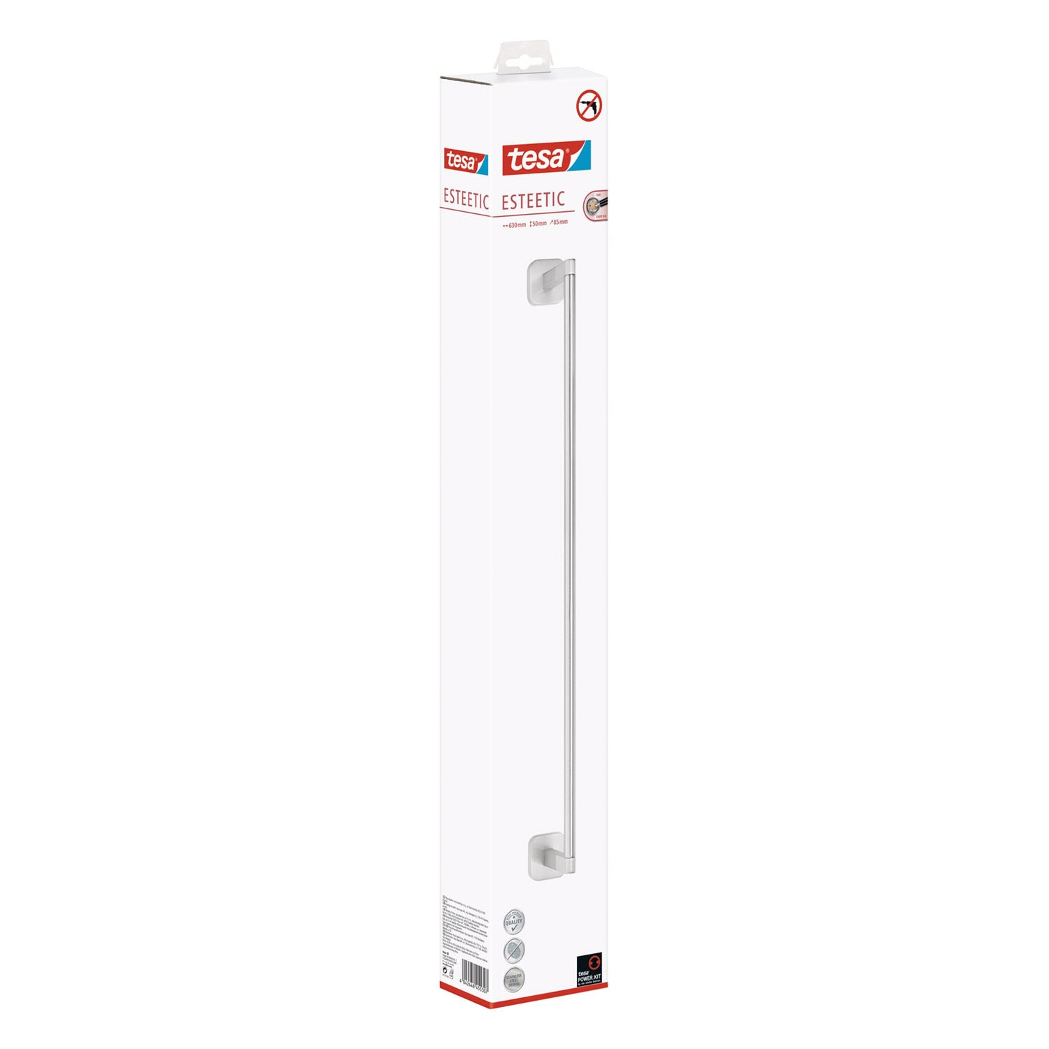 Moderne, geradlinige Form trifft auf edel verchromte Oberfläche: Der Handtuchhalter bringt Ordnung ins Badezimmer - gibt Handtuch, Duschtuch oder Badetuch einen Platz. Beständige Klebetechnologie mit hervorragender Haltekraft - ohne Bohrlöcher: Die Handtuch-Halterung hinterlässt an Wänden im Badezimmer keine Schäden - empfehlenswert für Mietwohnungen, rostfrei. Unkomplizierte, saubere Wandmontage: Mit der tesa Power.Kit Technologie zur einfachen Befestigung an der Wand - ohne Bohrmaschine, ohne handwerkliche Vorkenntnisse, ohne den sonst anfallenden Schmutz