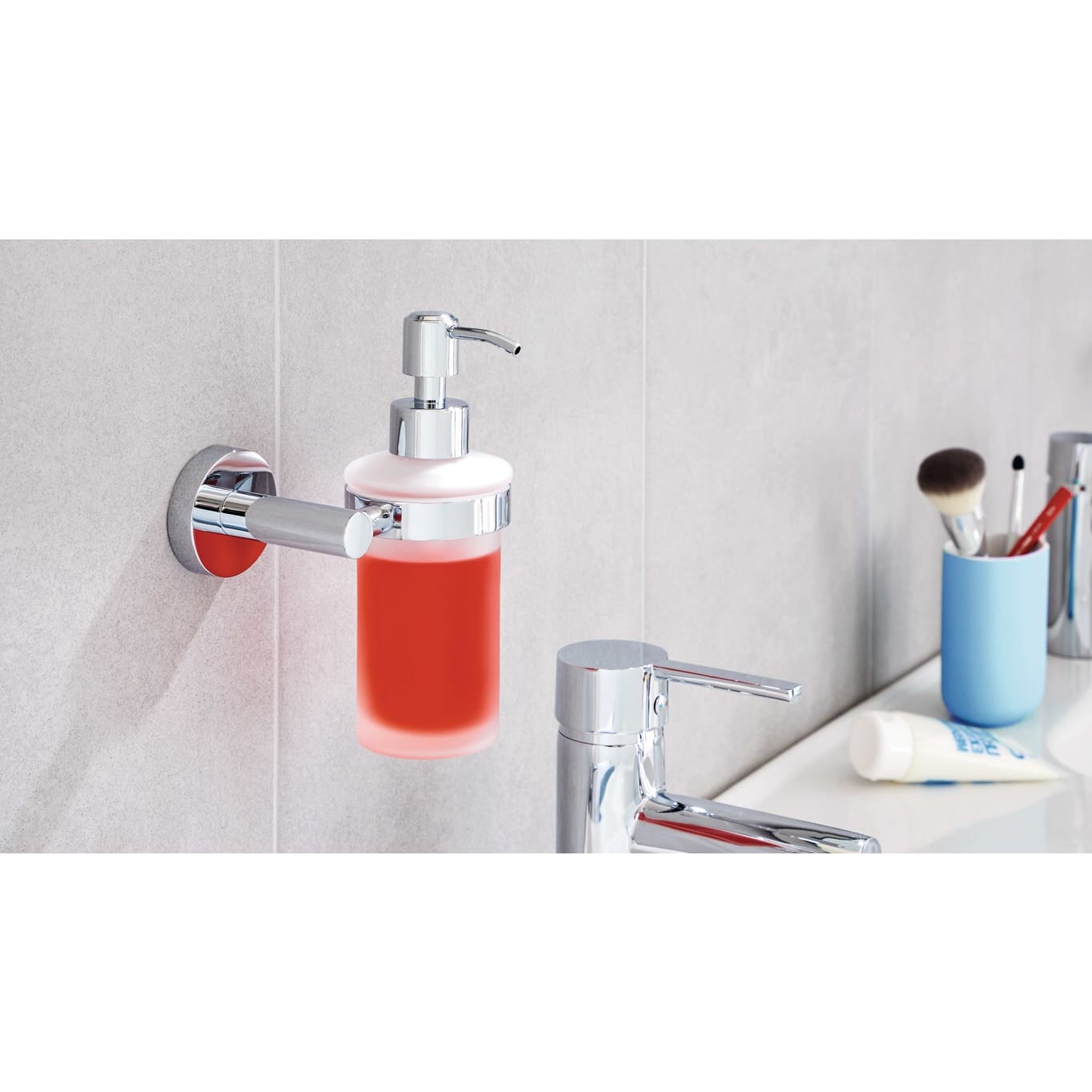 Verchromte Oberfläche und Milchglas: Spender für Flüssigseife mit Wandhalterung - Bad. Keine Schäden - empfehlenswert für Mietwohnungen, rostfrei. Unkomplizierte, saubere Wandmontage: Mit der tesa Power.Kit Technologie zur einfachen Befestigung an der Wand - ohne Bohrmaschine, ohne handwerkliche Vorkenntnisse, ohne den sonst anfallenden Schmutz.