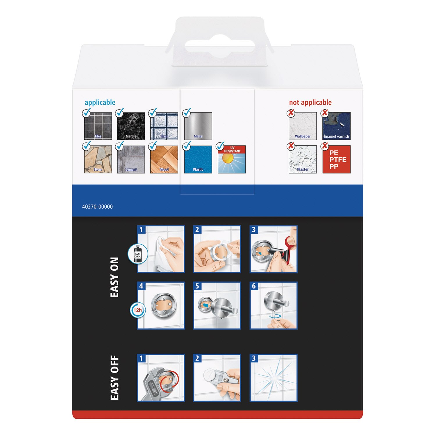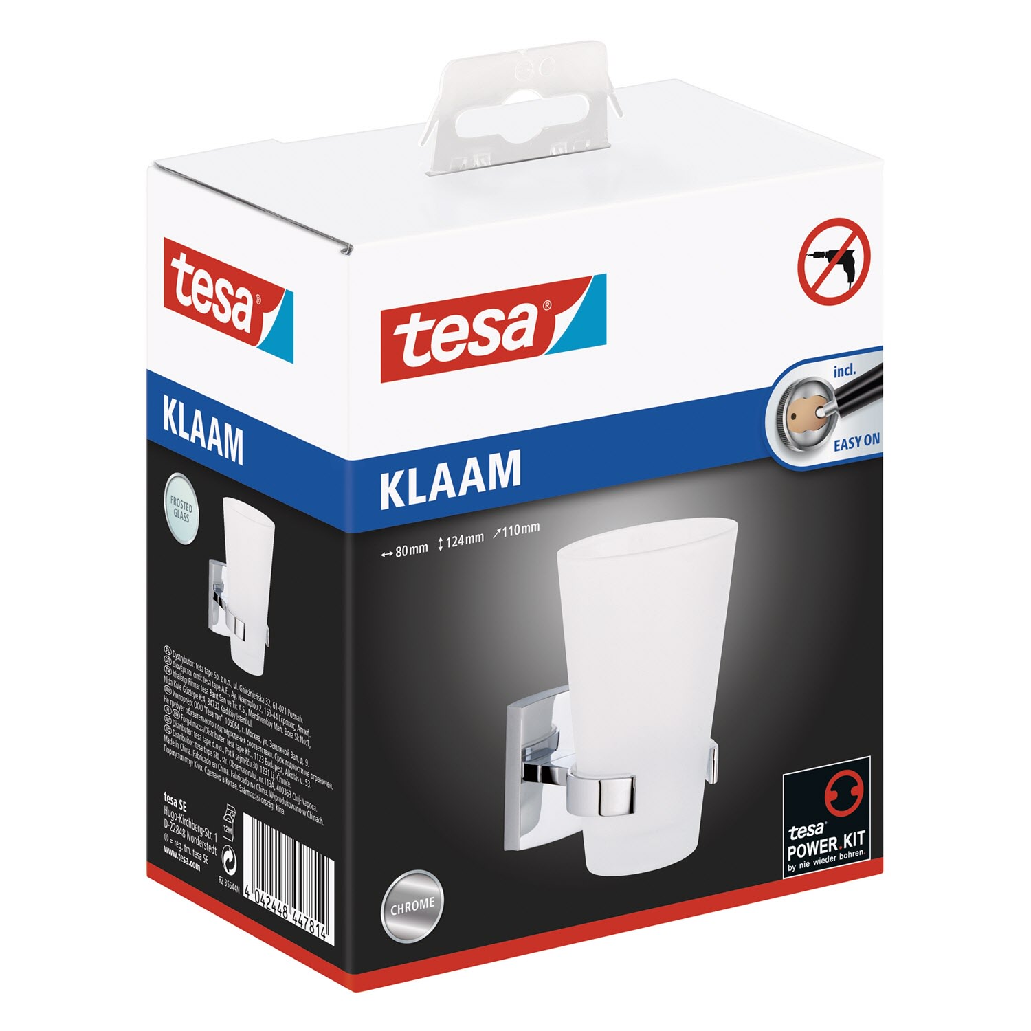 Ein attraktives Duo fürs Bad: Edler Zahnputzbecher aus satiniertem Glas, gehalten von einem edlen, verchromten Zahnbecherhalter - ein praktisches Bad-Accessoire, das einen eleganten Akzent bietet. Leistungsstarke, beständige Klebetechnologie, die keine Bohrlöcher hinterlässt: Der Halter für den Mundbecher trägt Belastungen bis zu 6 kg - die Wände im Badezimmer bleiben dabei unbeschädigt. Unkomplizierte, saubere Wandmontage: Mit der tesa Power.Kit Technologie zur einfachen Befestigung an der Wand - ohne Bohrmaschine, ohne handwerkliche Vorkenntnisse, ohne den sonst anfallenden Schmutz.