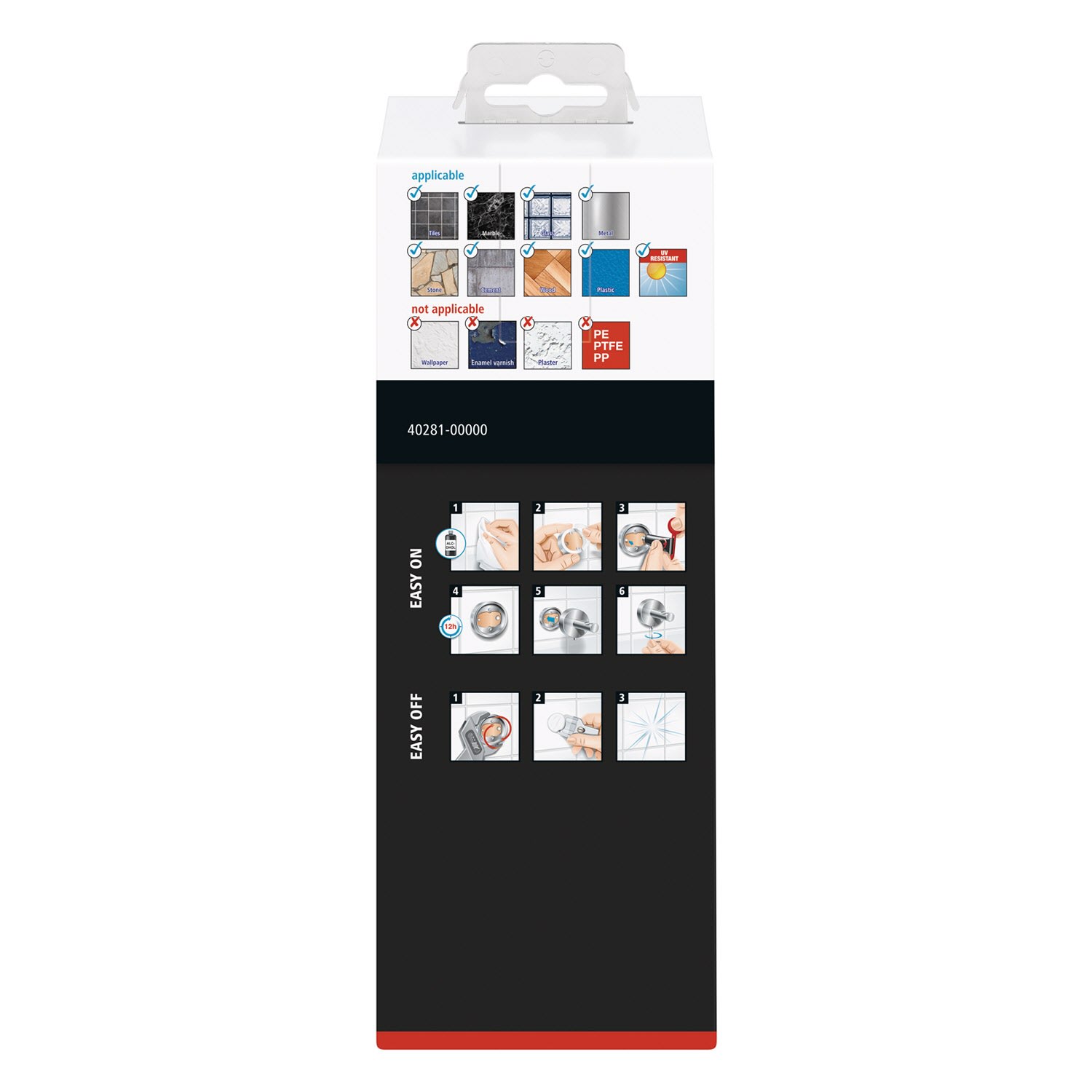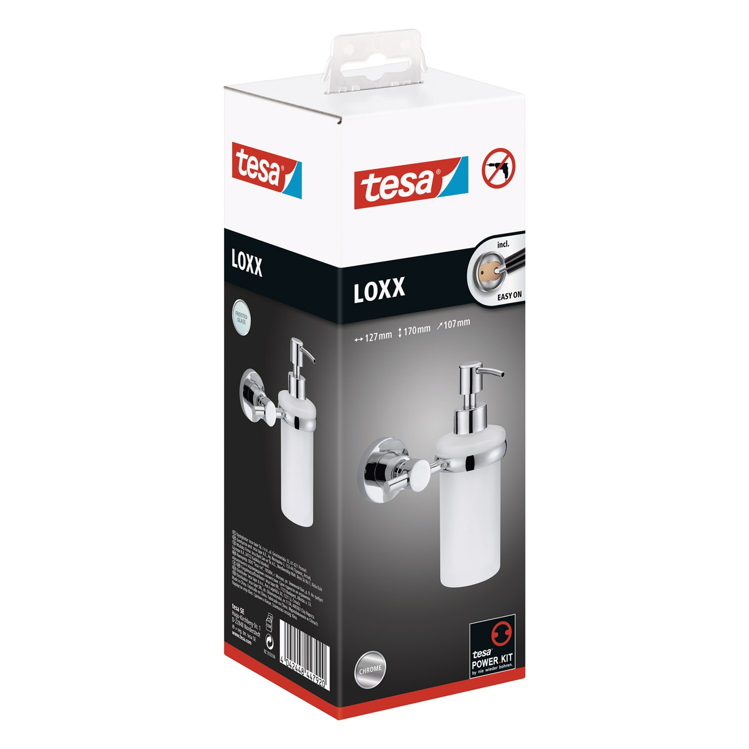 Verchromter Edelstahl und satiniertes Glas in harmonischem Zusammenspiel: Spender für Flüssigseife mit Wandhalterung - ein elementarer Gegenstand wird zu einem Design-Element in Bad. Keine Bohrlöcher hinterlässt: Die Halterung für den Pumpspender trägt Belastungen bis zu 6 kg - die Wände im Badezimmer bleiben dabei unbeschädigt. Unkomplizierte, saubere Wandmontage: Mit der tesa Power.Kit Technologie zur einfachen Befestigung an der Wand - ohne Bohrmaschine, ohne handwerkliche Vorkenntnisse, ohne den sonst anfallenden Schmutz