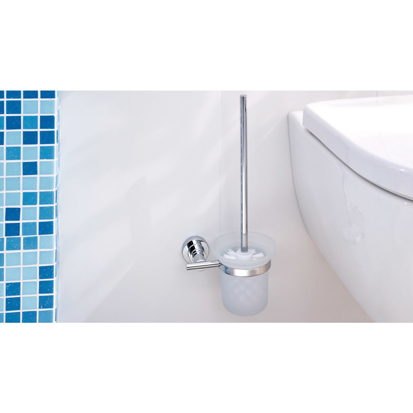 Satiniertes Glas und verchromter Edelstahl harmonisch kombiniert: WC-Bürstengarnitur mit Wandhalterung, Behälter und WC-Bürste - ein funktionales Werkzeug wird zum stilvollen Accessoire. Leistungsstarke, beständige Klebetechnologie, die keine Bohrlöcher hinterlässt: Der Toilettenbürstenhalter ist bis zu 6 kg belastbar - die Wände im Badezimmer bleiben dabei unbeschädigt. Unkomplizierte, saubere Wandmontage: Mit der tesa Power.Kit Technologie zur einfachen Befestigung an der Wand - ohne Bohrmaschine, ohne handwerkliche Vorkenntnisse, ohne den sonst anfallenden Schmutz