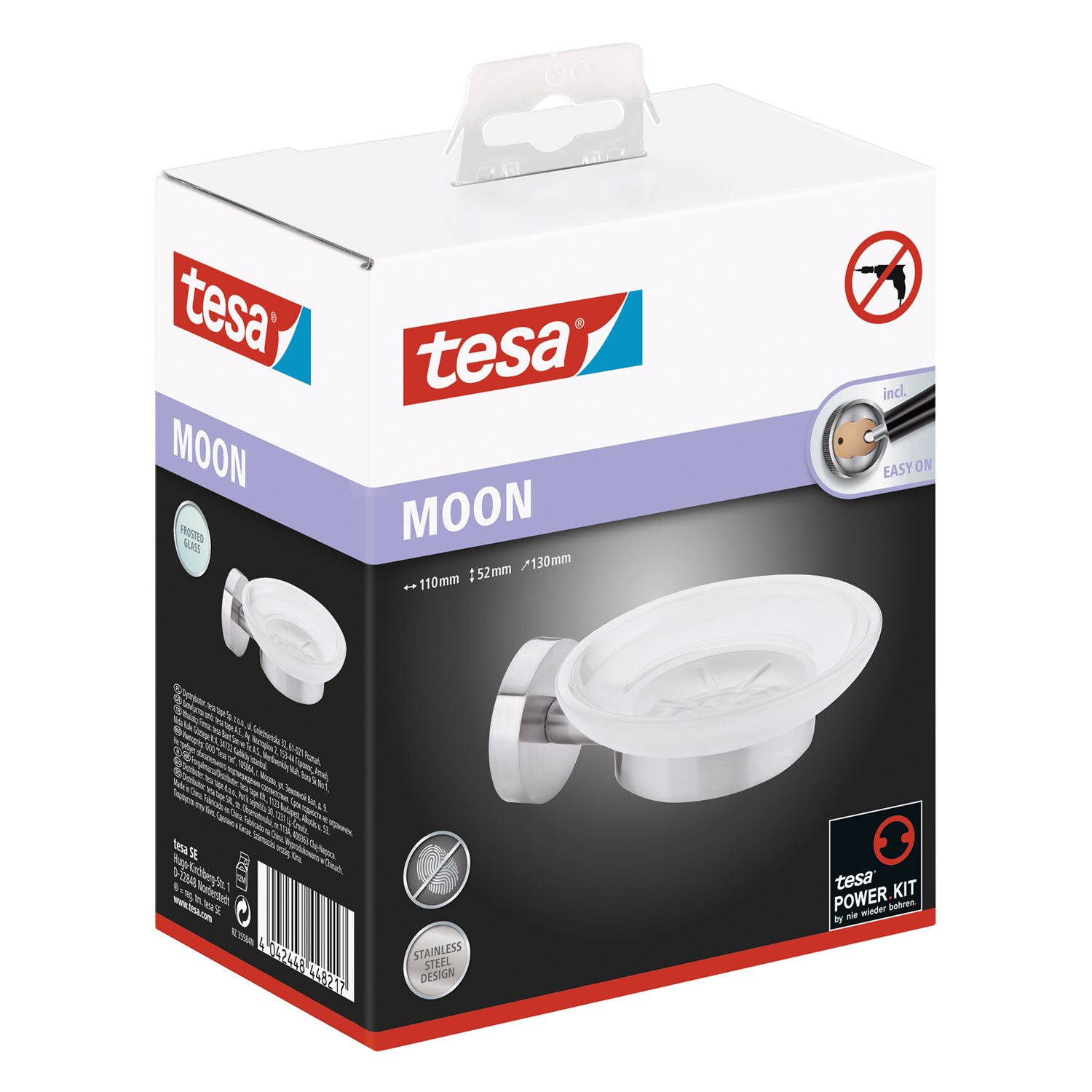 Verchromter Edelstahl ergänzt durch satiniertes Glas: Ideal als Ablage für Handseife, festes Shampoo oder festes Duschgel - und ein elegantes Accessoire. Leistungsstarke, beständige Klebetechnologie, die keine Bohrlöcher hinterlässt: Der Seifenhalter trägt Belastungen bis zu 6 kg - die Wände im Badezimmer bleiben dabei unbeschädigt. Unkomplizierte, saubere Wandmontage: Mit der tesa Power.Kit Technologie zur einfachen Befestigung an der Wand - ohne Bohrmaschine, ohne handwerkliche Vorkenntnisse, ohne den sonst anfallenden Schmutz.