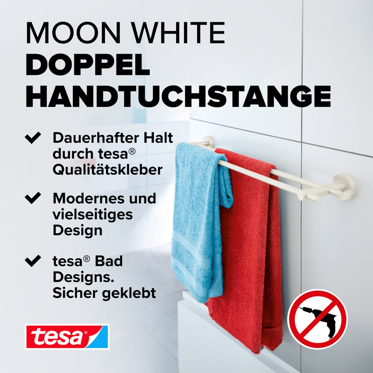 - Leistungsstarke, beständige Klebetechnologie, die keine Bohrlöcher hinterlässt: Die Doppel-Handtuchstange trägt Belastungen bis zu 12 kg - die Wände im Badezimmer bleiben dabei unbeschädigt