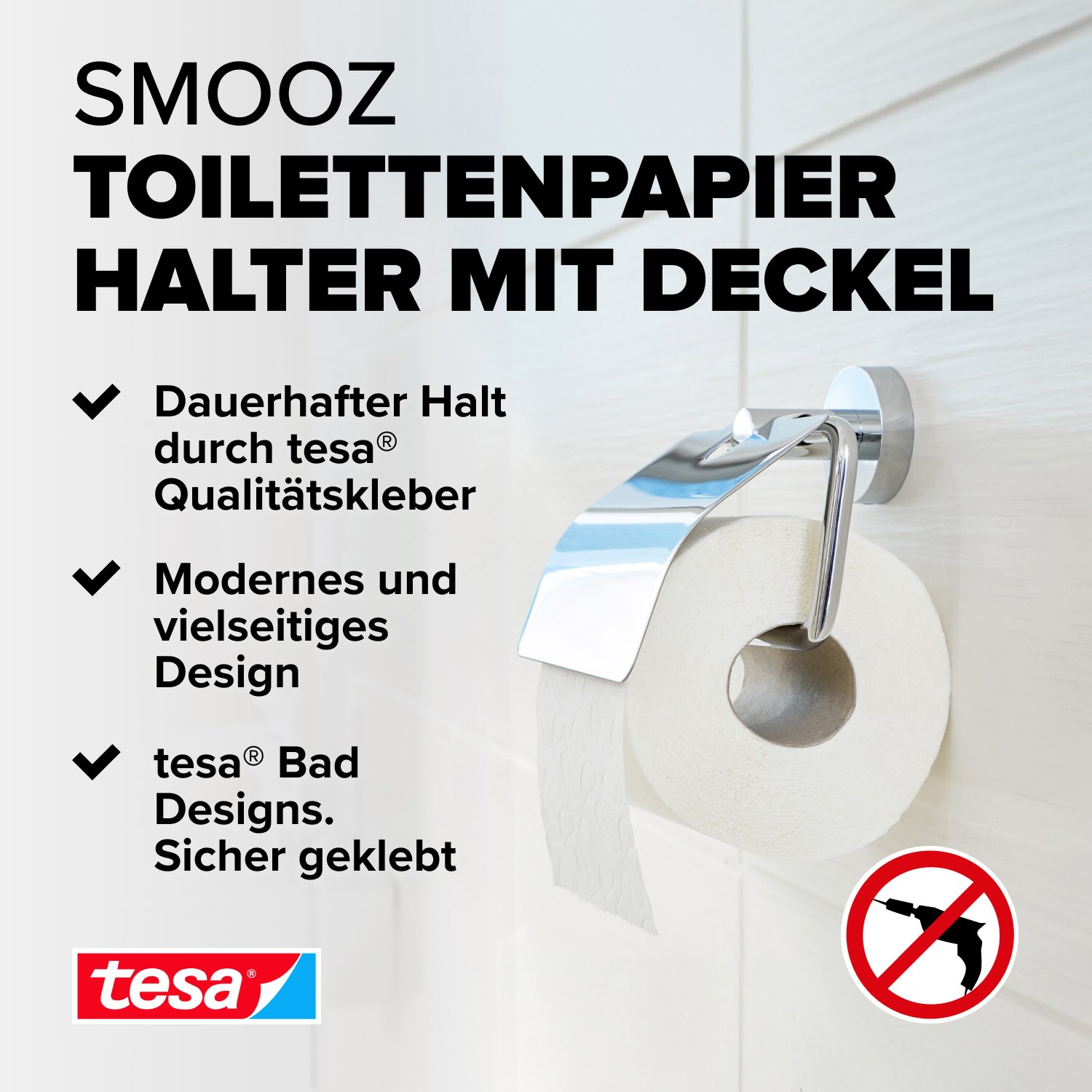 Der WC-Rollenhalter mit Deckel - ein edler Blickfang. Leistungsstarke, beständige Klebetechnologie, die keine Bohrlöcher hinterlässt: Der Papierrollenhalter trägt Belastungen bis zu 6 kg - die Wände im Badezimmer bleiben dabei unbeschädigt. Unkomplizierte, saubere Wandmontage: Mit der tesa Power.Kit Technologie zur einfachen Befestigung an der Wand - ohne Bohrmaschine, ohne handwerkliche Vorkenntnisse, ohne den sonst anfallenden Schmutz.
