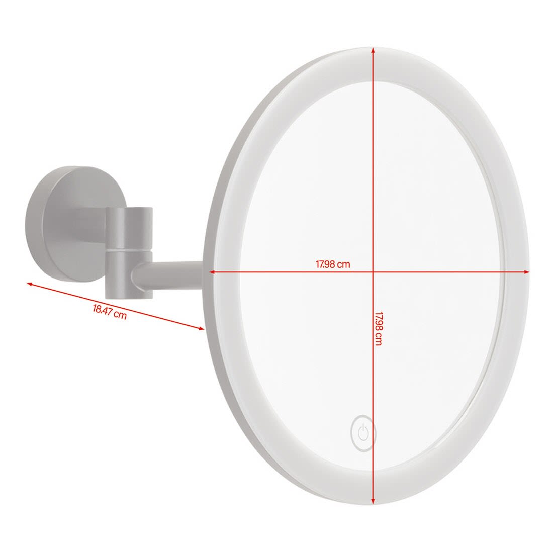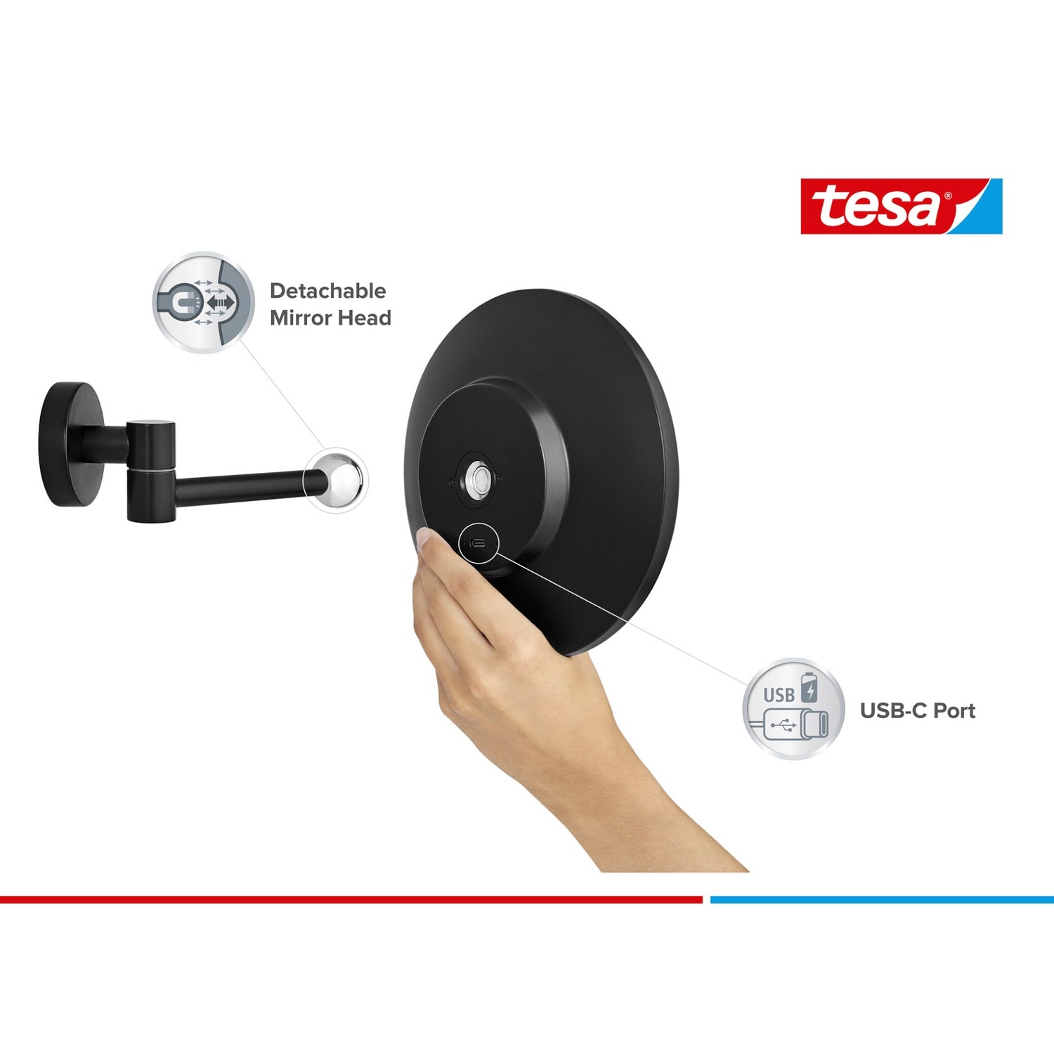 - Lieferumfang: LED-Schminkspiegel in Schwarz mit Ø 18 cm, Gelenkarm zur Befestigung, USB-C-Kabel zum Aufladen und tesa Power.Kit Klebelösung