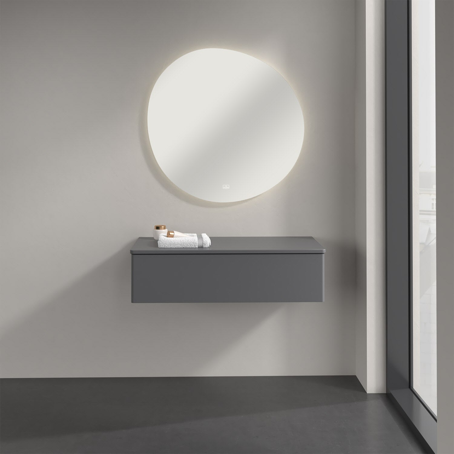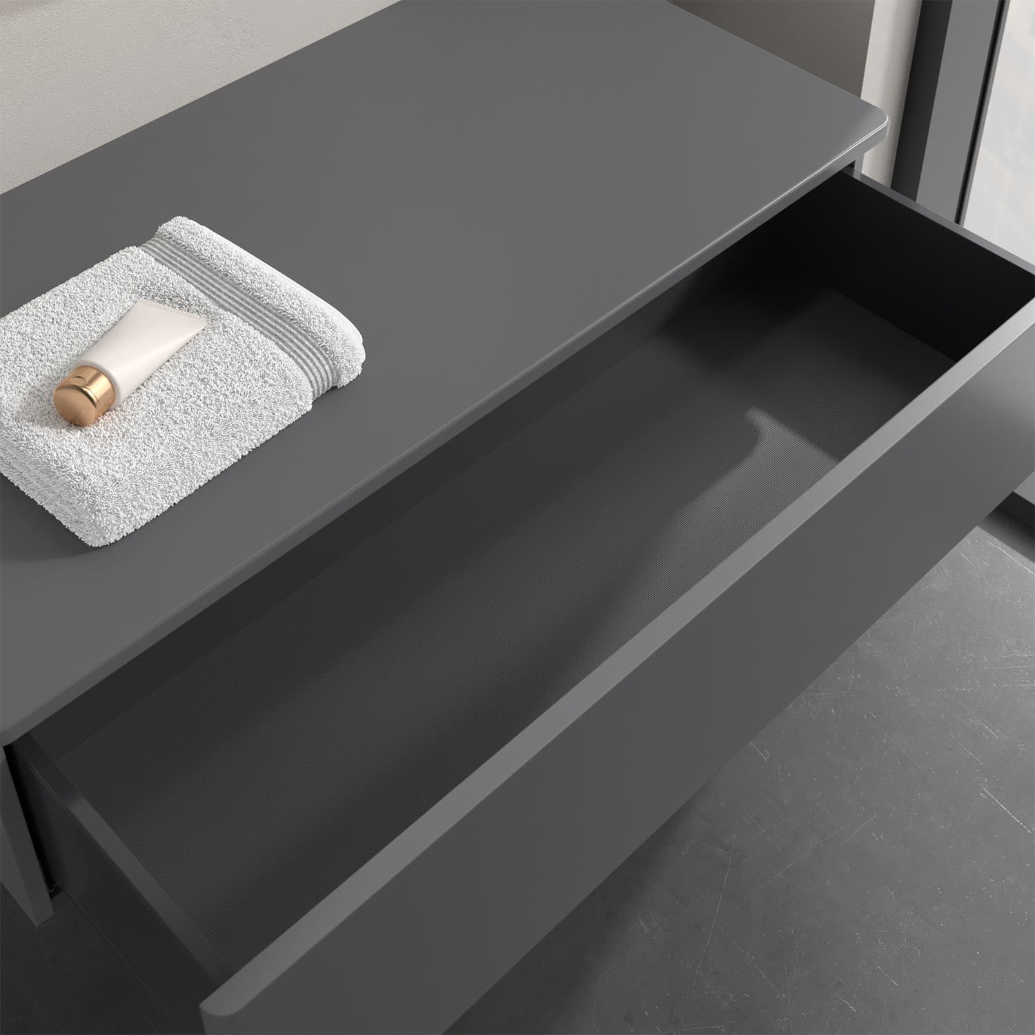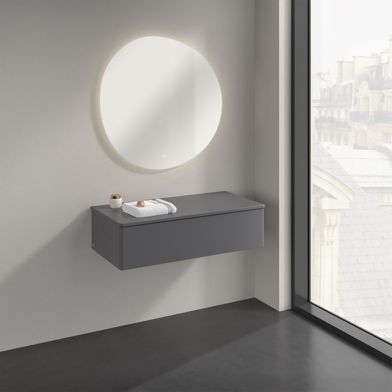 Ein hochwertiges Badmöbel von Villeroy & Boch mit sanfter Formsprache durch abgerundete Kanten: Das wandhängende Sideboard der Kollektion Antao bietet eine ideale Stauraummöglichkeit im Badezimmer und ist auch optisch ein Blickfang. Es verfügt über einen grifflosen Auszug mit Push-to-Open Funktion. Er lässt sich in seiner vollen Tiefe öffnen und ermöglicht so großzügigen Stauraum für diverse Utensilien, über die man nicht den Überblick verliert. Der integrierte Antirutschboden sorgt dabei dafür, dass der Inhalt sicher und fest steht. Handtücher oder auch Dekoartikel finden auf der Ablagefläche bequem ihren Platz. Für eine besonders leichte Pflege sorgt die mehrschichtig deckend lackierte Oberfläche.