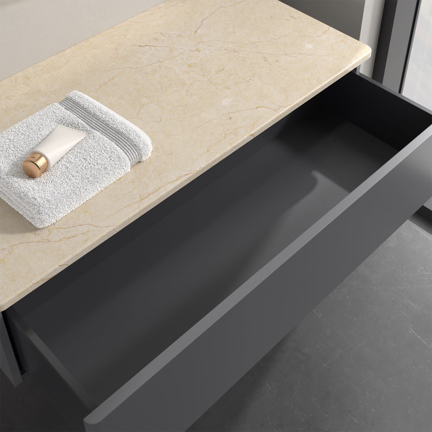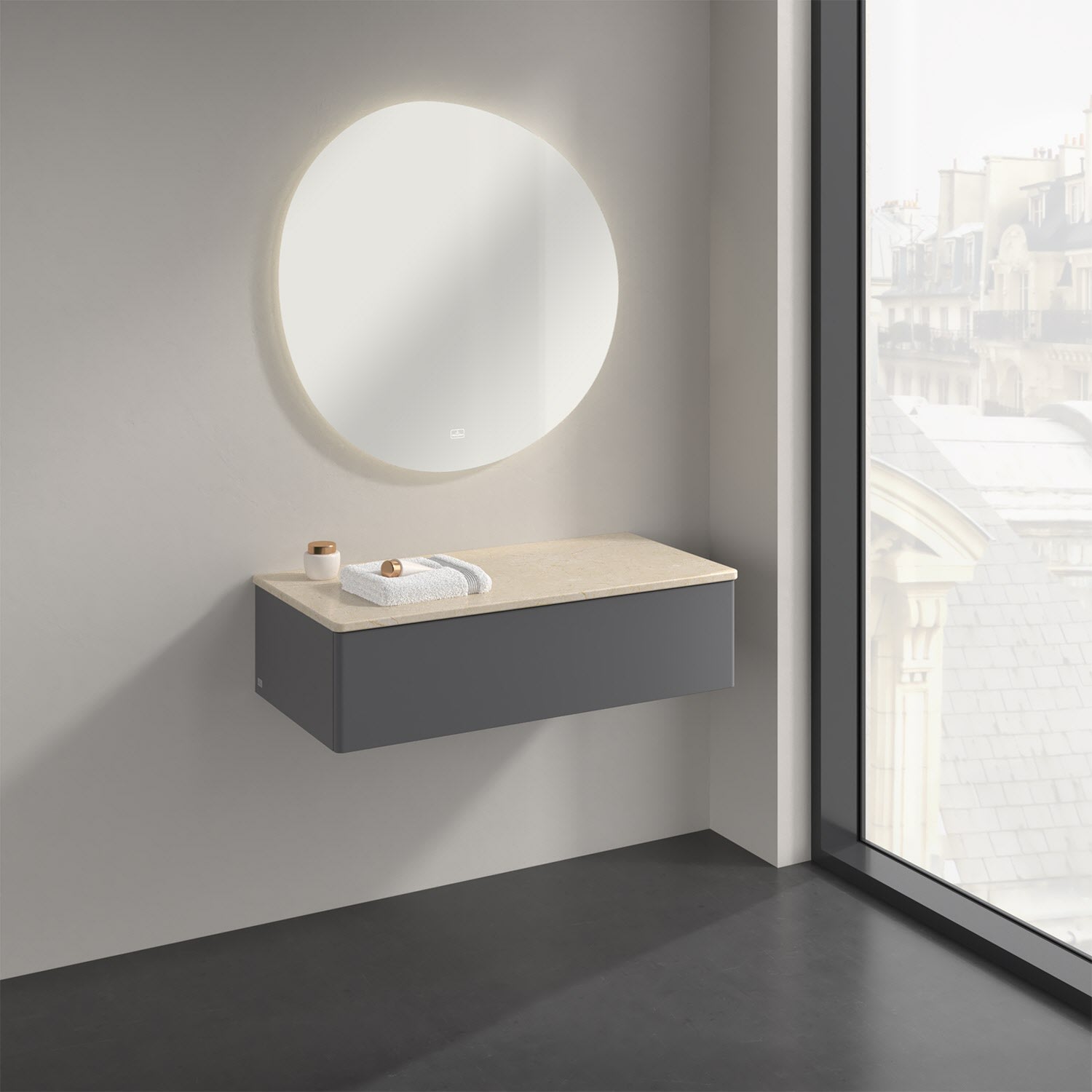 Ein hochwertiges Badmöbel von Villeroy & Boch mit sanfter Formsprache durch abgerundete Kanten: Das wandhängende Sideboard der Kollektion Antao bietet eine ideale Stauraummöglichkeit im Badezimmer und ist auch optisch ein Blickfang. Es verfügt über einen grifflosen Auszug mit Push-to-Open Funktion. Er lässt sich in seiner vollen Tiefe öffnen und ermöglicht so großzügigen Stauraum für diverse Utensilien, über die man nicht den Überblick verliert. Der integrierte Antirutschboden sorgt dabei dafür, dass der Inhalt sicher und fest steht. Handtücher oder auch Dekoartikel finden auf der Ablagefläche bequem ihren Platz. Für eine besonders leichte Pflege sorgt die mehrschichtig deckend lackierte Oberfläche. Bei der Ausführung in Massivholz wird dank des verarbeiteten Massivholzes jedes Möbel zu einem Unikat, das sich durch das lebendige Naturmaterial durch seine einzigartige Struktur und Maserung auszeichnet.
