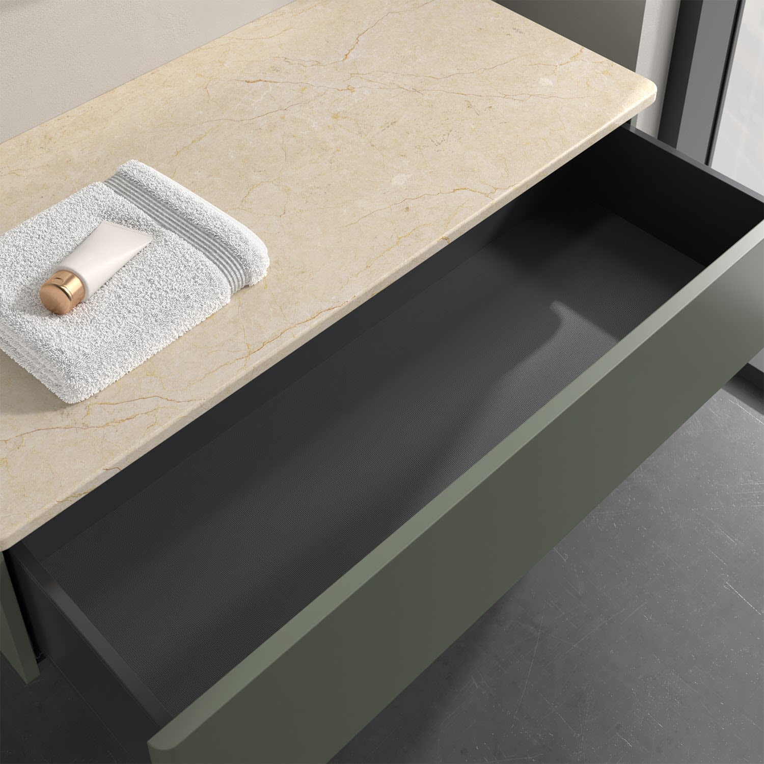 - kein Umfallen oder Verrutschen von Pflegeprodukten in den Schubladen dank rutschhemmendem Boden