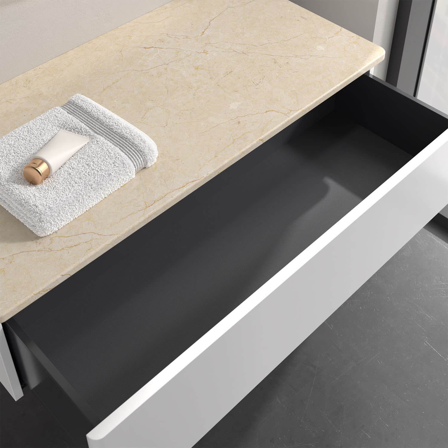 - kein Umfallen oder Verrutschen von Pflegeprodukten in den Schubladen dank rutschhemmendem Boden