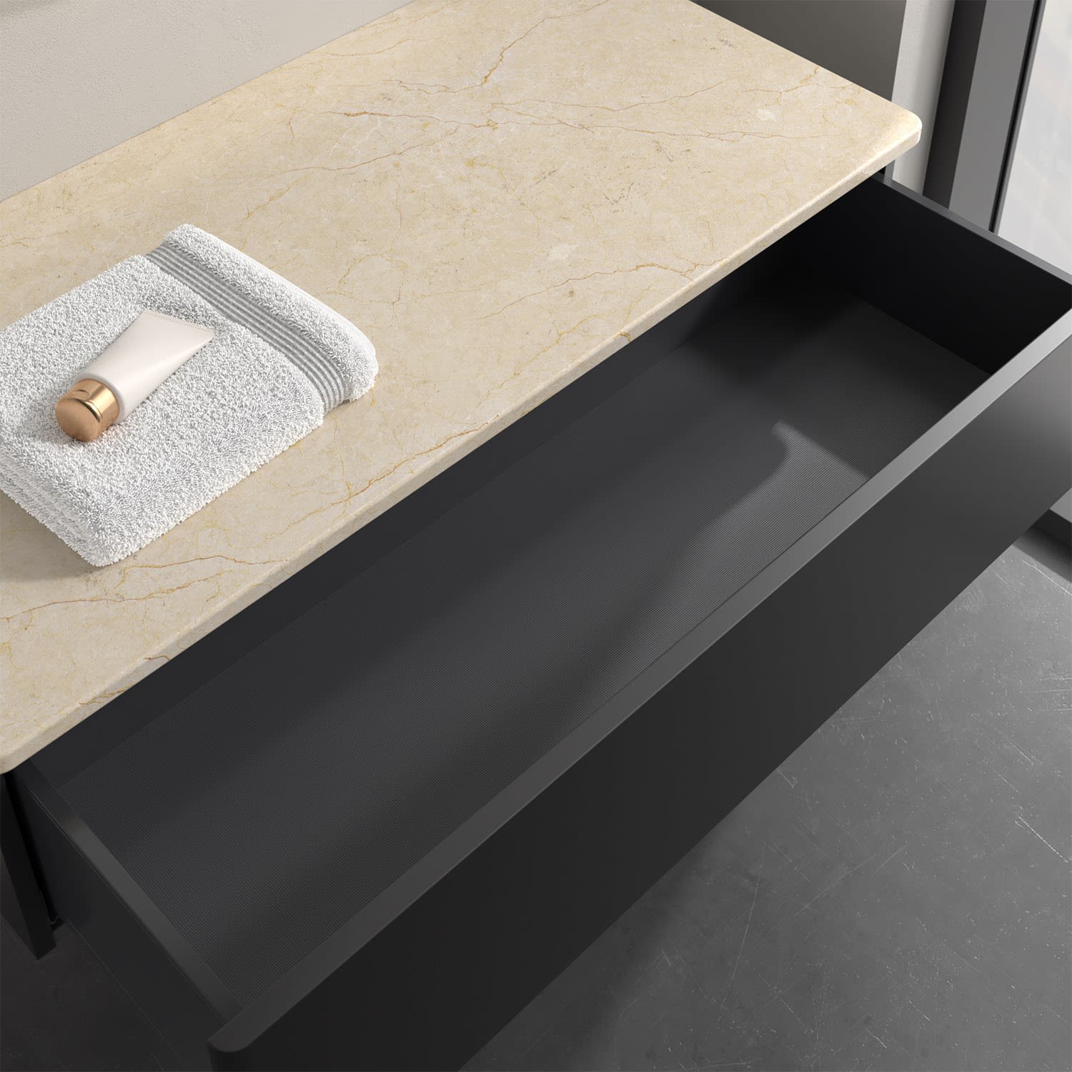- kein Umfallen oder Verrutschen von Pflegeprodukten in den Schubladen dank rutschhemmendem Boden
