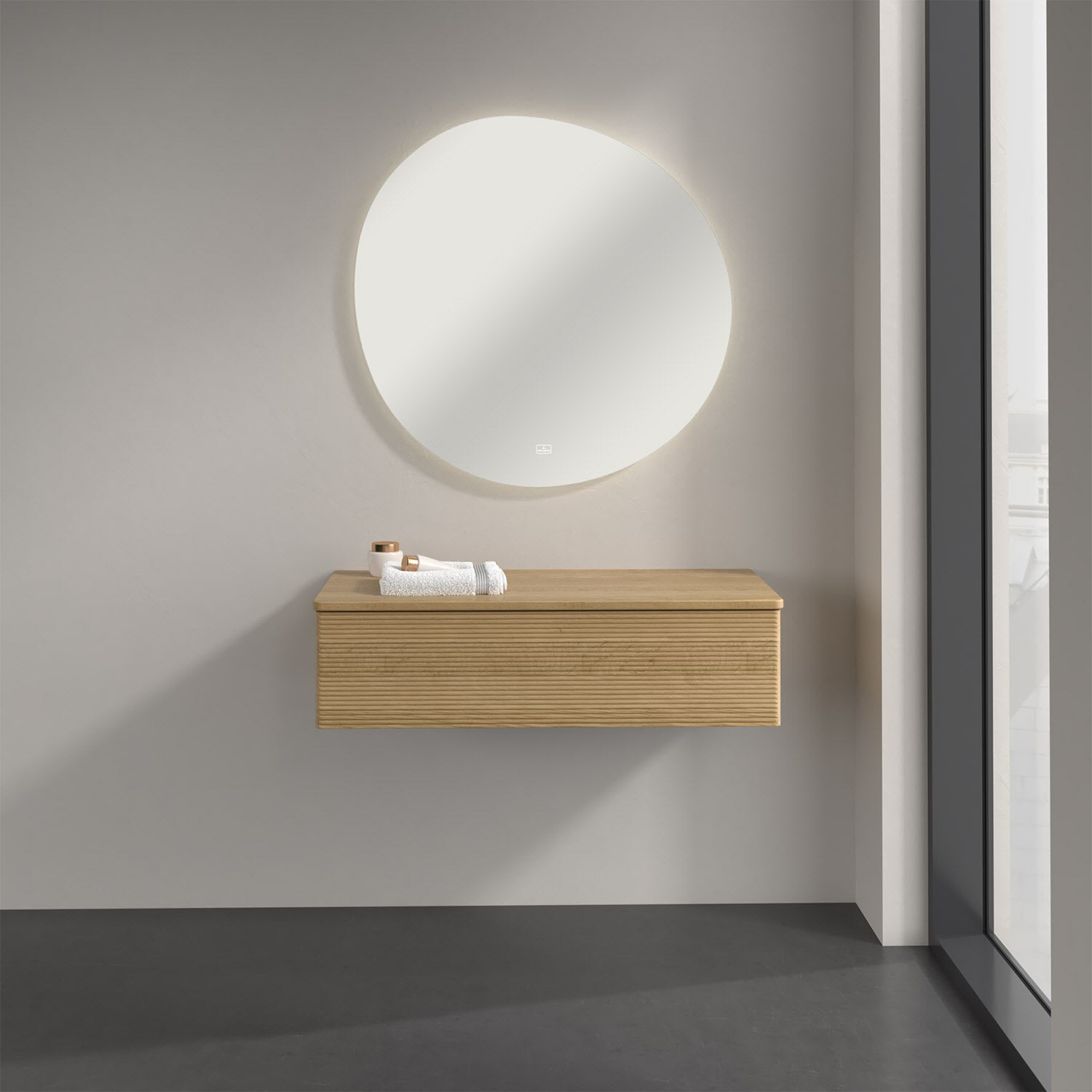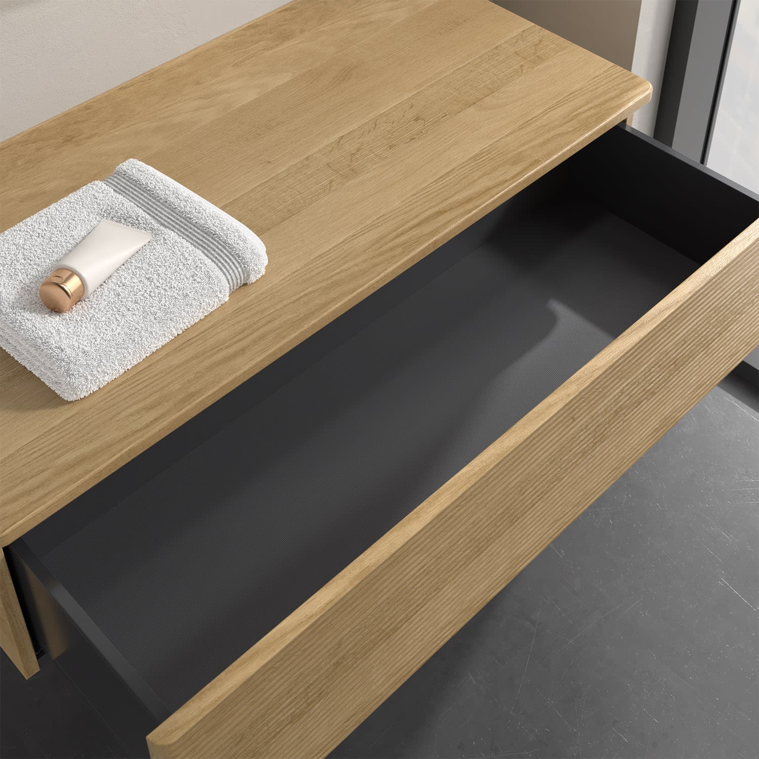 Ein hochwertiges Badmöbel von Villeroy & Boch mit sanfter Formsprache durch abgerundete Kanten: Das wandhängende Sideboard der Kollektion Antao bietet eine ideale Stauraummöglichkeit im Badezimmer und ist auch optisch ein Blickfang. Es verfügt über einen grifflosen Auszug mit strukturierter Front und Push-to-Open Funktion. Er lässt sich in seiner vollen Tiefe öffnen und ermöglicht so großzügigen Stauraum für diverse Utensilien, über die man nicht den Überblick verliert. Der integrierte Antirutschboden sorgt dabei dafür, dass der Inhalt sicher und fest steht. Handtücher oder auch Dekoartikel finden auf der Ablagefläche bequem ihren Platz. Für eine besonders leichte Pflege sorgt die mehrschichtig deckend lackierte Oberfläche. Bei der Ausführung in Massivholz wird dank des verarbeiteten Massivholzes jedes Möbel zu einem Unikat, das sich durch das lebendige Naturmaterial durch seine einzigartige Struktur und Maserung auszeichnet.