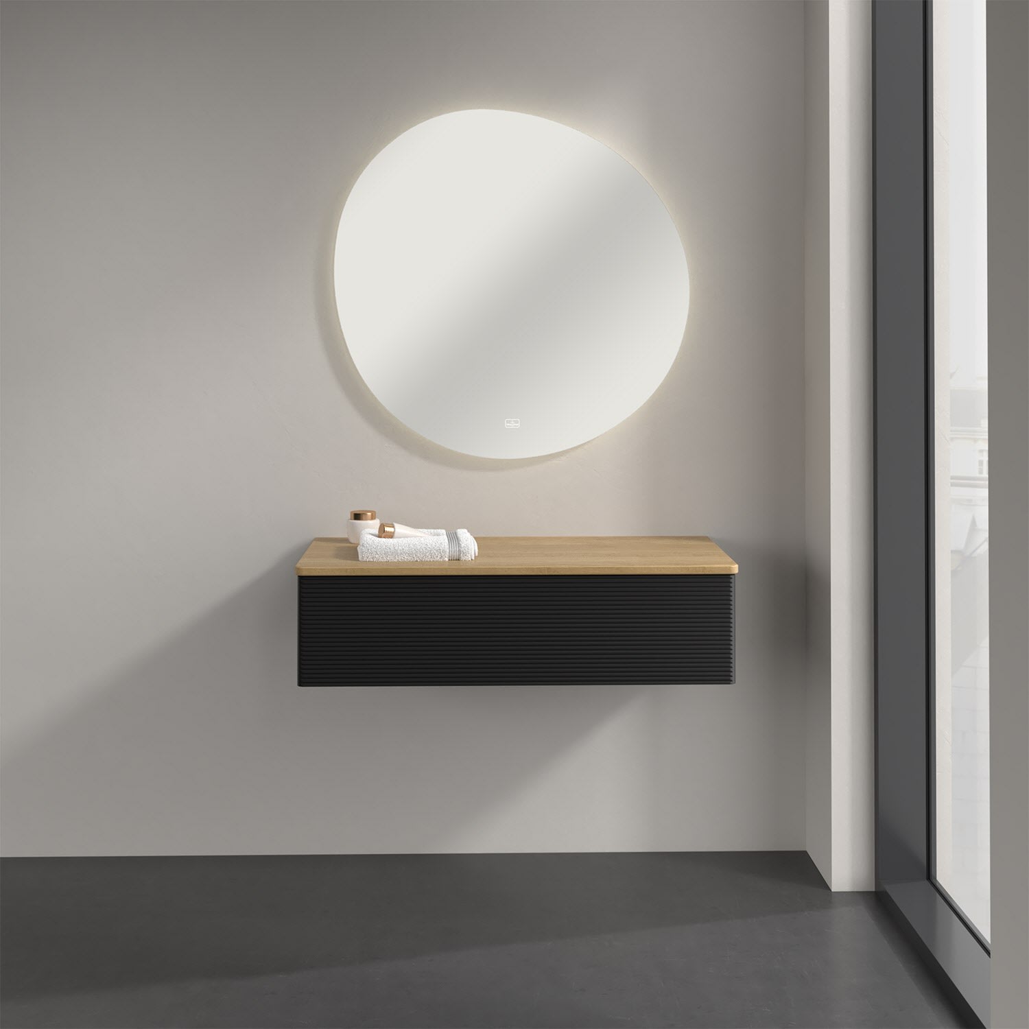 Ein hochwertiges Badmöbel von Villeroy & Boch mit sanfter Formsprache durch abgerundete Kanten: Das wandhängende Sideboard der Kollektion Antao bietet eine ideale Stauraummöglichkeit im Badezimmer und ist auch optisch ein Blickfang. Es verfügt über einen grifflosen Auszug mit strukturierter Front und Push-to-Open Funktion. Er lässt sich in seiner vollen Tiefe öffnen und ermöglicht so großzügigen Stauraum für diverse Utensilien, über die man nicht den Überblick verliert. Der integrierte Antirutschboden sorgt dabei dafür, dass der Inhalt sicher und fest steht. Handtücher oder auch Dekoartikel finden auf der Ablagefläche bequem ihren Platz. Für eine besonders leichte Pflege sorgt die mehrschichtig deckend lackierte Oberfläche. Bei der Ausführung in Massivholz wird dank des verarbeiteten Massivholzes jedes Möbel zu einem Unikat, das sich durch das lebendige Naturmaterial durch seine einzigartige Struktur und Maserung auszeichnet.