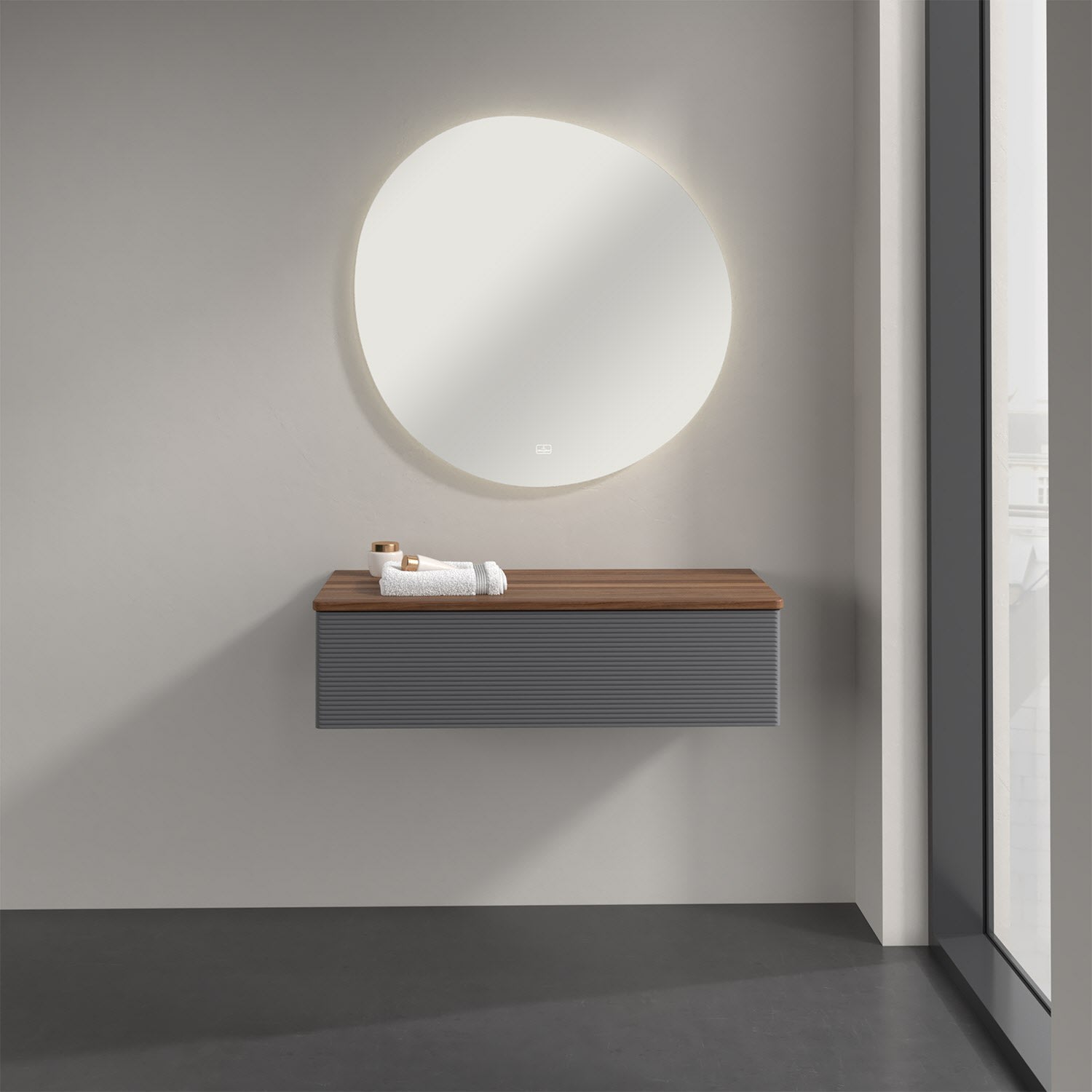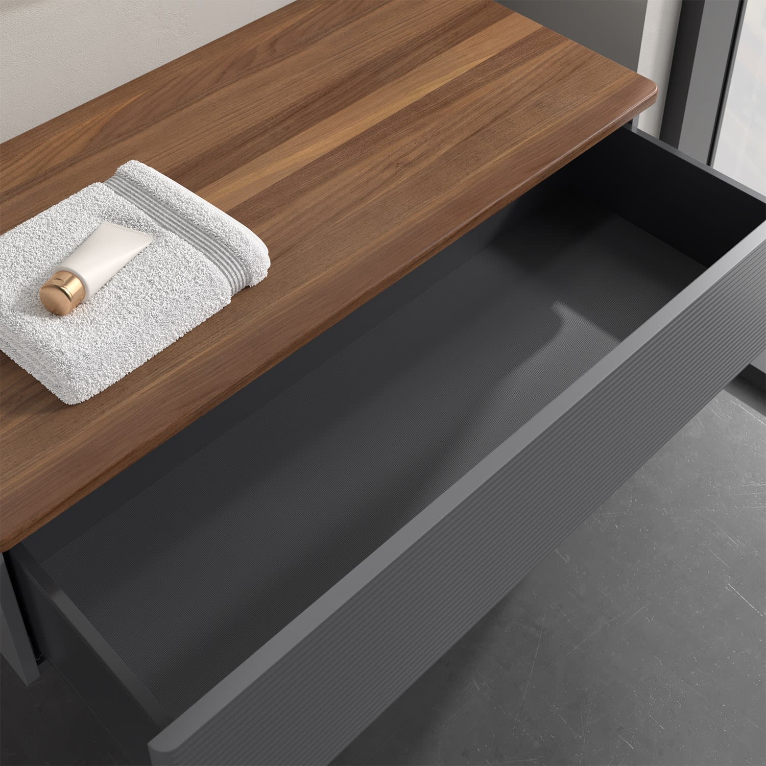 Ein hochwertiges Badmöbel von Villeroy & Boch mit sanfter Formsprache durch abgerundete Kanten: Das wandhängende Sideboard der Kollektion Antao bietet eine ideale Stauraummöglichkeit im Badezimmer und ist auch optisch ein Blickfang. Es verfügt über einen grifflosen Auszug mit strukturierter Front und Push-to-Open Funktion. Er lässt sich in seiner vollen Tiefe öffnen und ermöglicht so großzügigen Stauraum für diverse Utensilien, über die man nicht den Überblick verliert. Der integrierte Antirutschboden sorgt dabei dafür, dass der Inhalt sicher und fest steht. Handtücher oder auch Dekoartikel finden auf der Ablagefläche bequem ihren Platz. Für eine besonders leichte Pflege sorgt die mehrschichtig deckend lackierte Oberfläche. Bei der Ausführung in Massivholz wird dank des verarbeiteten Massivholzes jedes Möbel zu einem Unikat, das sich durch das lebendige Naturmaterial durch seine einzigartige Struktur und Maserung auszeichnet.