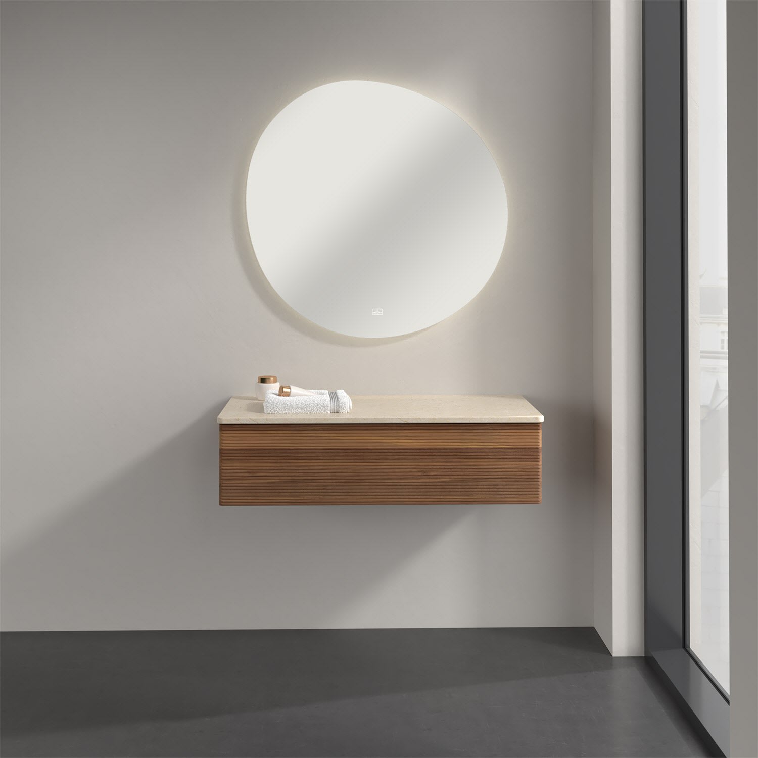 Ein hochwertiges Badmöbel von Villeroy & Boch mit sanfter Formsprache durch abgerundete Kanten: Das wandhängende Sideboard der Kollektion Antao bietet eine ideale Stauraummöglichkeit im Badezimmer und ist auch optisch ein Blickfang. Es verfügt über einen grifflosen Auszug mit strukturierter Front und Push-to-Open Funktion. Er lässt sich in seiner vollen Tiefe öffnen und ermöglicht so großzügigen Stauraum für diverse Utensilien, über die man nicht den Überblick verliert. Der integrierte Antirutschboden sorgt dabei dafür, dass der Inhalt sicher und fest steht. Handtücher oder auch Dekoartikel finden auf der Ablagefläche bequem ihren Platz. Für eine besonders leichte Pflege sorgt die mehrschichtig deckend lackierte Oberfläche. Bei der Ausführung in Massivholz wird dank des verarbeiteten Massivholzes jedes Möbel zu einem Unikat, das sich durch das lebendige Naturmaterial durch seine einzigartige Struktur und Maserung auszeichnet.