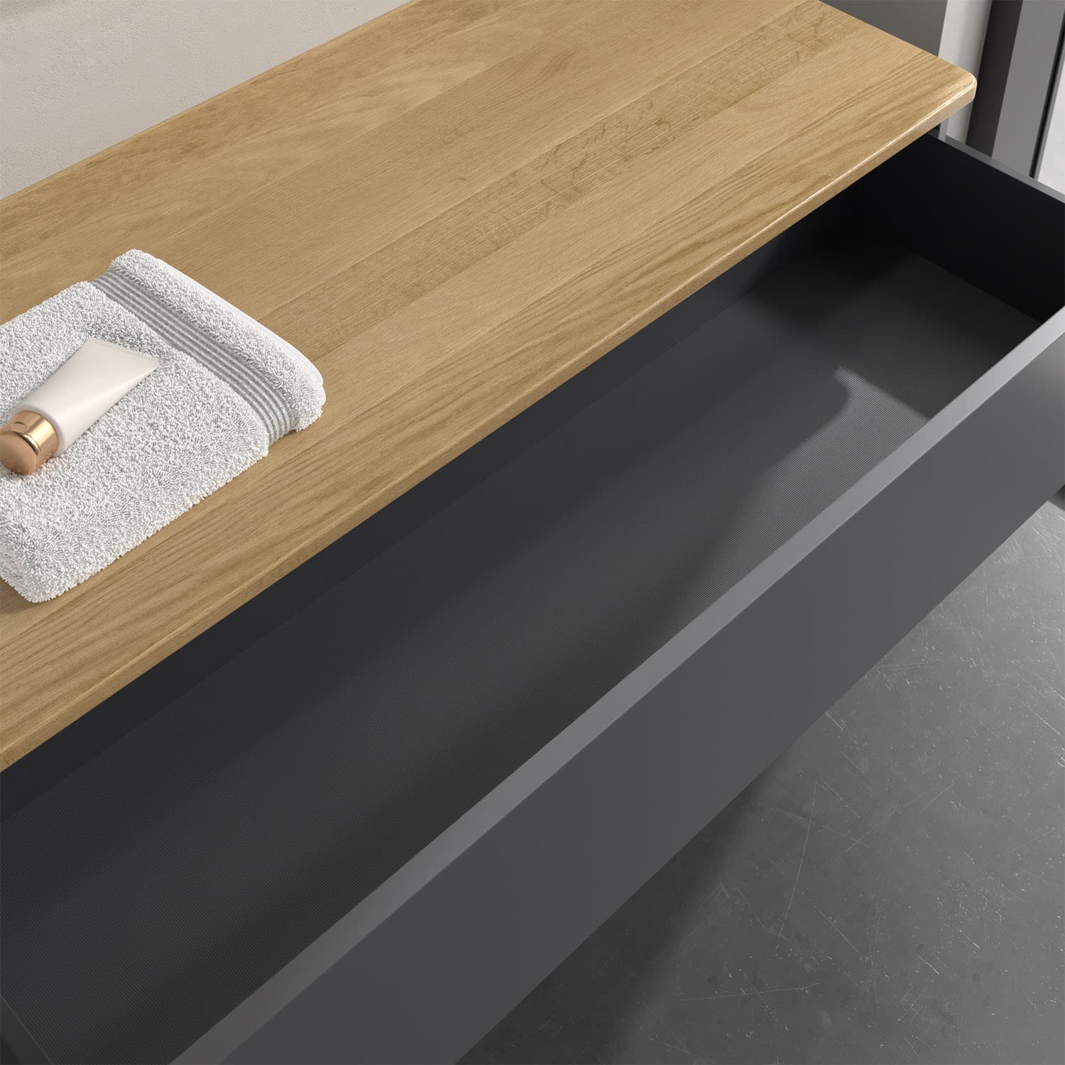 - kein Umfallen oder Verrutschen von Pflegeprodukten in den Schubladen dank rutschhemmendem Boden