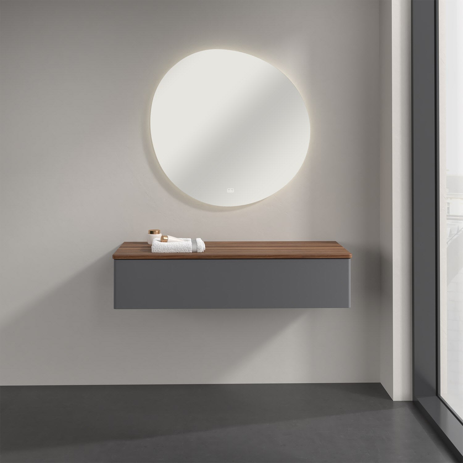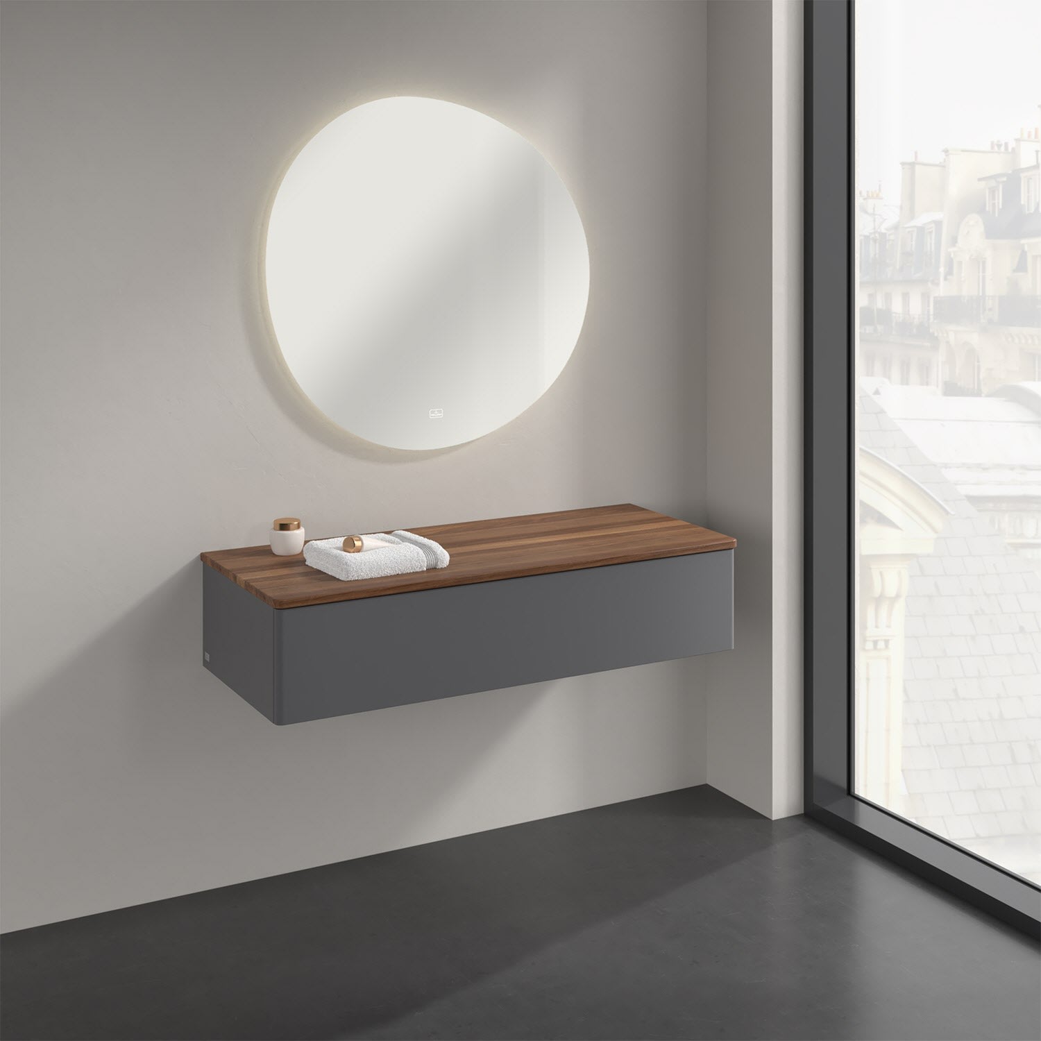 Ein hochwertiges Badmöbel von Villeroy & Boch mit sanfter Formsprache durch abgerundete Kanten: Das wandhängende Sideboard der Kollektion Antao bietet eine ideale Stauraummöglichkeit im Badezimmer und ist auch optisch ein Blickfang. Es verfügt über einen grifflosen Auszug mit Push-to-Open Funktion. Er lässt sich in seiner vollen Tiefe öffnen und ermöglicht so großzügigen Stauraum für diverse Utensilien, über die man nicht den Überblick verliert. Der integrierte Antirutschboden sorgt dabei dafür, dass der Inhalt sicher und fest steht. Handtücher oder auch Dekoartikel finden auf der Ablagefläche bequem ihren Platz. Für eine besonders leichte Pflege sorgt die mehrschichtig deckend lackierte Oberfläche. Bei der Ausführung in Massivholz wird dank des verarbeiteten Massivholzes jedes Möbel zu einem Unikat, das sich durch das lebendige Naturmaterial durch seine einzigartige Struktur und Maserung auszeichnet.