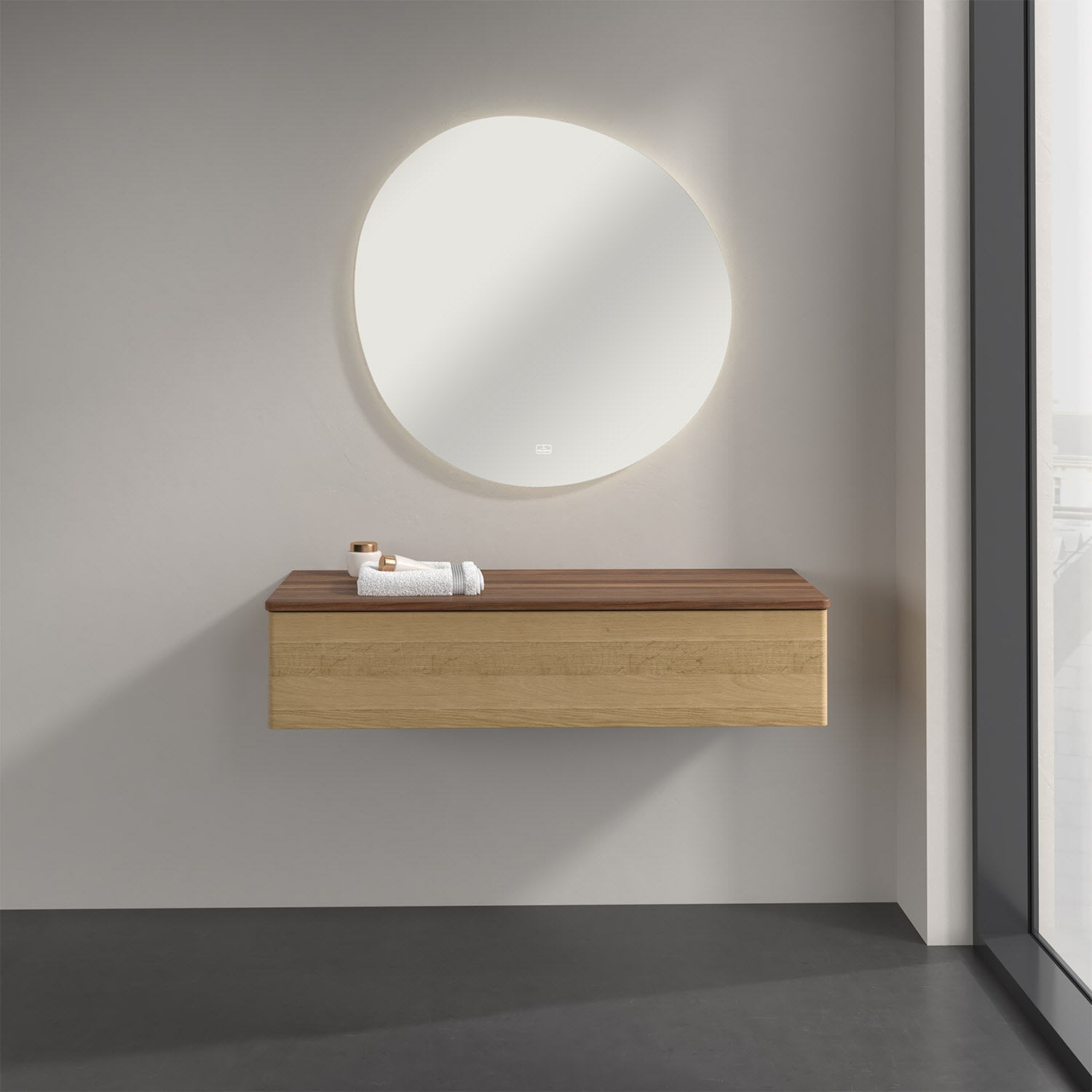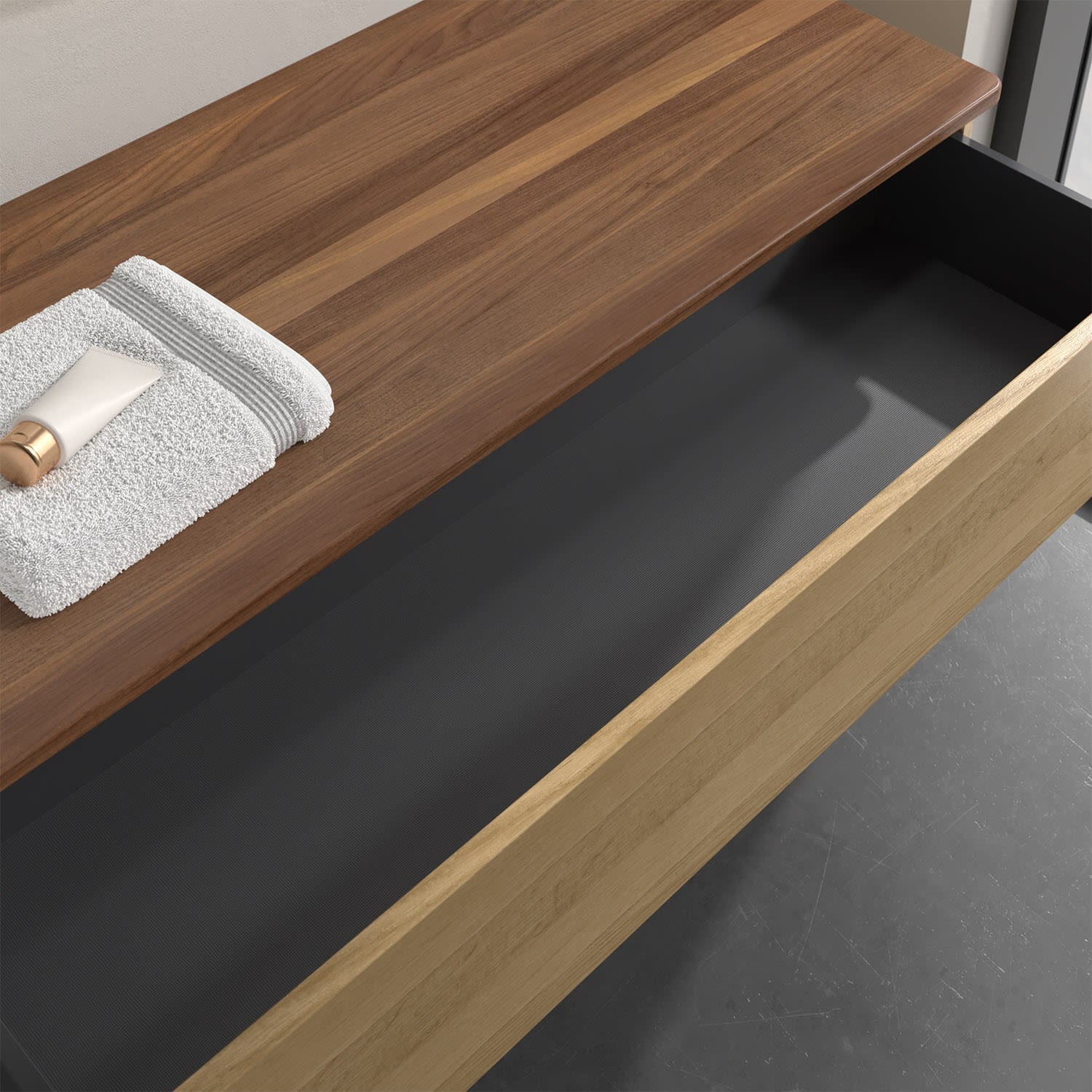 Ein hochwertiges Badmöbel von Villeroy & Boch mit sanfter Formsprache durch abgerundete Kanten: Das wandhängende Sideboard der Kollektion Antao bietet eine ideale Stauraummöglichkeit im Badezimmer und ist auch optisch ein Blickfang. Es verfügt über einen grifflosen Auszug mit Push-to-Open Funktion. Er lässt sich in seiner vollen Tiefe öffnen und ermöglicht so großzügigen Stauraum für diverse Utensilien, über die man nicht den Überblick verliert. Der integrierte Antirutschboden sorgt dabei dafür, dass der Inhalt sicher und fest steht. Handtücher oder auch Dekoartikel finden auf der Ablagefläche bequem ihren Platz. Für eine besonders leichte Pflege sorgt die mehrschichtig deckend lackierte Oberfläche. Bei der Ausführung in Massivholz wird dank des verarbeiteten Massivholzes jedes Möbel zu einem Unikat, das sich durch das lebendige Naturmaterial durch seine einzigartige Struktur und Maserung auszeichnet.