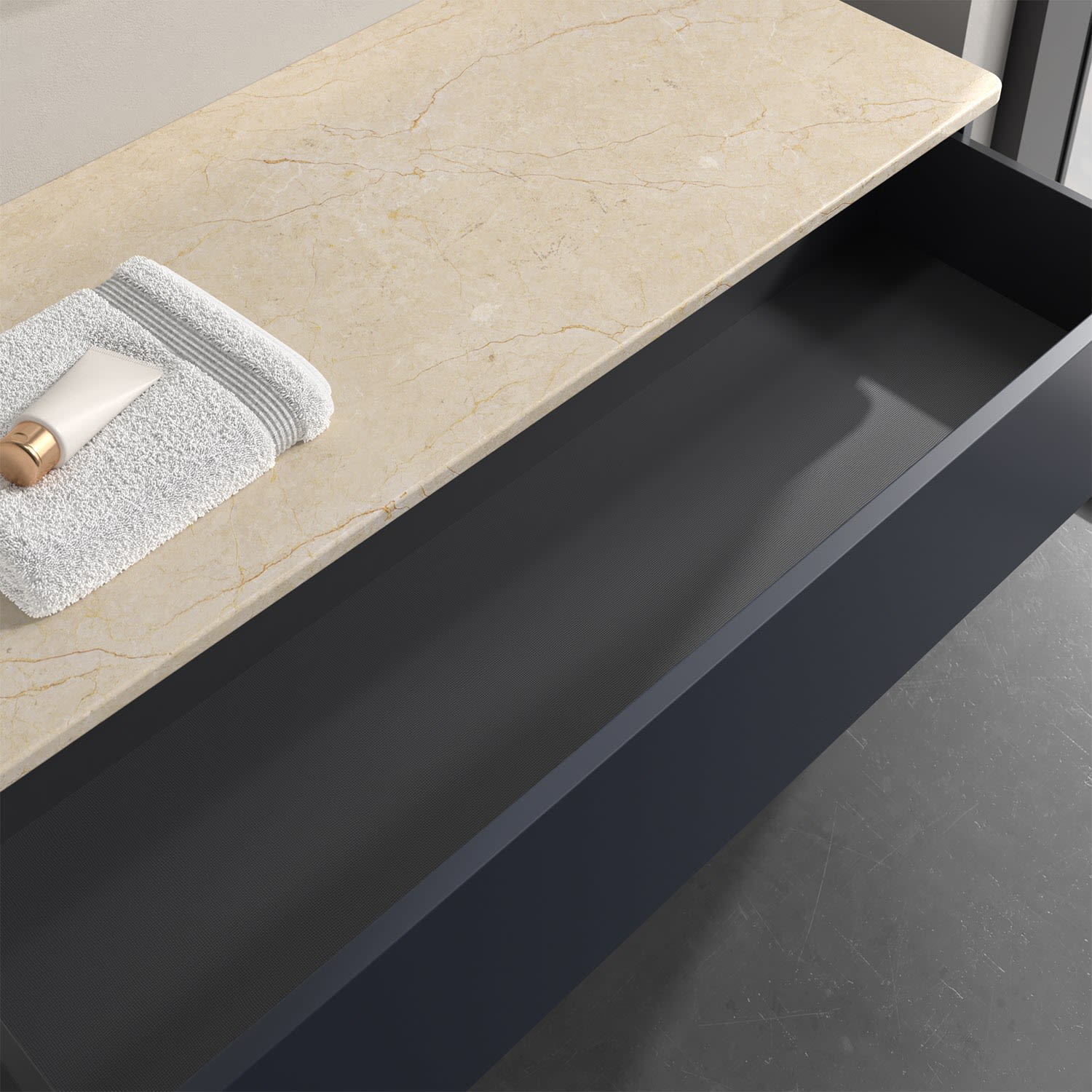 - kein Umfallen oder Verrutschen von Pflegeprodukten in den Schubladen dank rutschhemmendem Boden