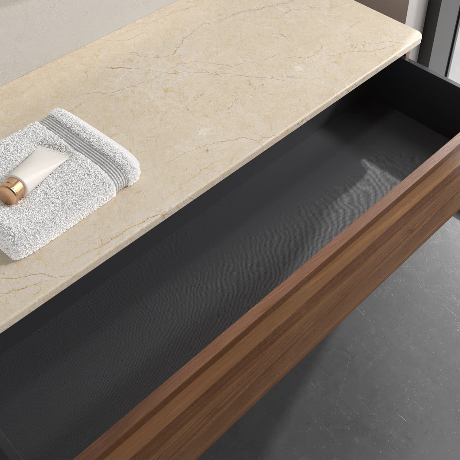 - kein Umfallen oder Verrutschen von Pflegeprodukten in den Schubladen dank rutschhemmendem Boden