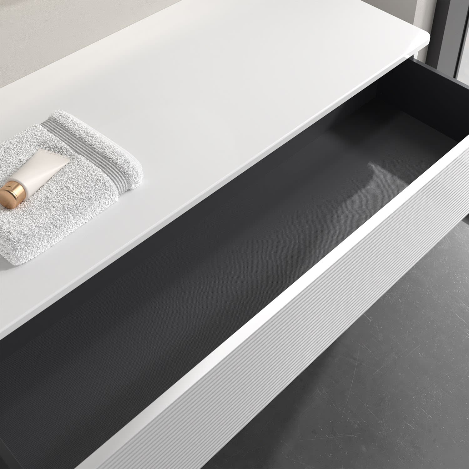 - kein Umfallen oder Verrutschen von Pflegeprodukten in den Schubladen dank rutschhemmendem Boden