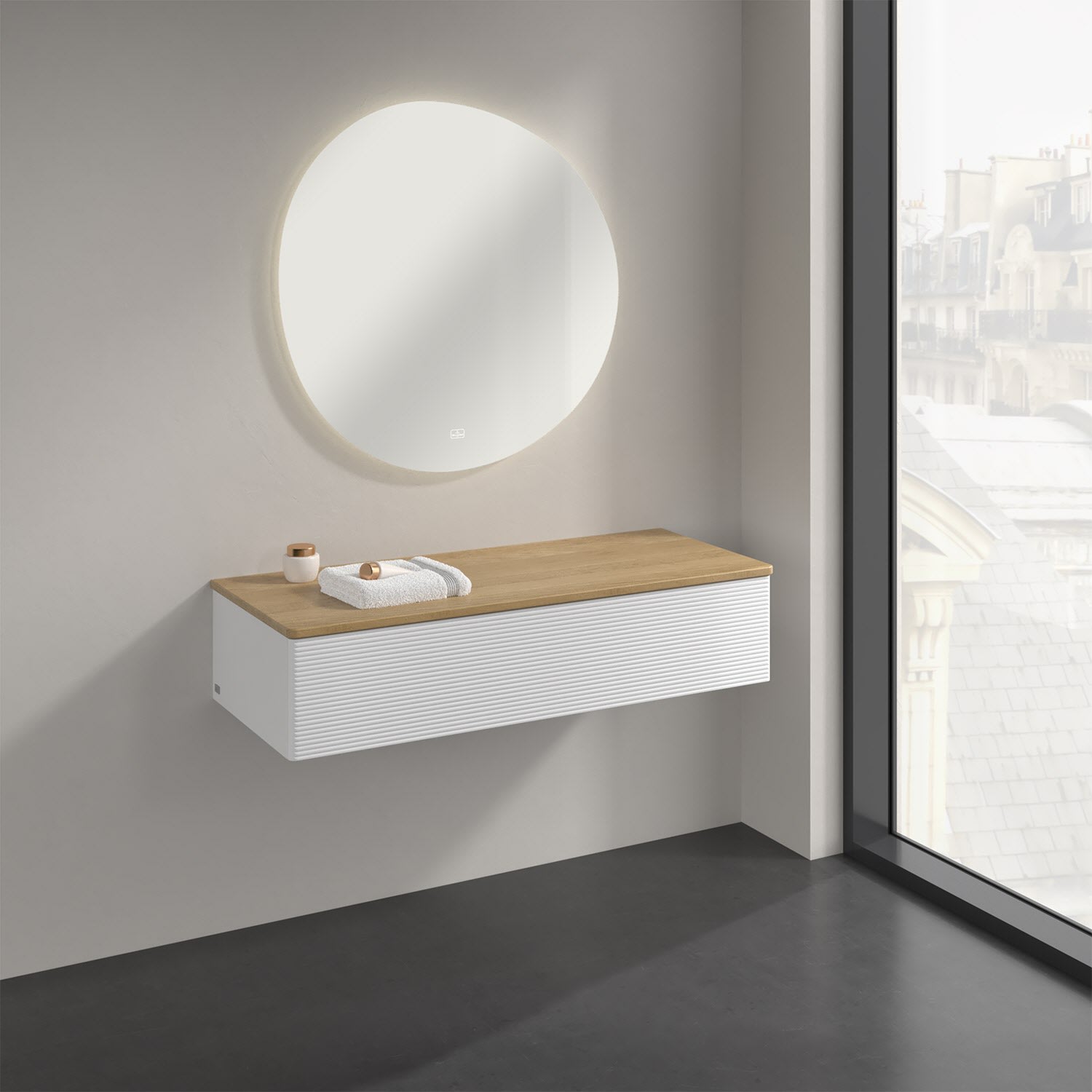 Ein hochwertiges Badmöbel von Villeroy & Boch mit sanfter Formsprache durch abgerundete Kanten: Das wandhängende Sideboard der Kollektion Antao bietet eine ideale Stauraummöglichkeit im Badezimmer und ist auch optisch ein Blickfang. Es verfügt über einen grifflosen Auszug mit strukturierter Front und Push-to-Open Funktion. Er lässt sich in seiner vollen Tiefe öffnen und ermöglicht so großzügigen Stauraum für diverse Utensilien, über die man nicht den Überblick verliert. Der integrierte Antirutschboden sorgt dabei dafür, dass der Inhalt sicher und fest steht. Handtücher oder auch Dekoartikel finden auf der Ablagefläche bequem ihren Platz. Für eine besonders leichte Pflege sorgt die mehrschichtig deckend lackierte Oberfläche. Bei der Ausführung in Massivholz wird dank des verarbeiteten Massivholzes jedes Möbel zu einem Unikat, das sich durch das lebendige Naturmaterial durch seine einzigartige Struktur und Maserung auszeichnet.