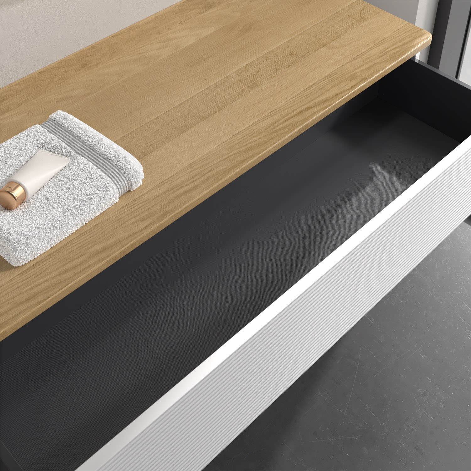 Ein hochwertiges Badmöbel von Villeroy & Boch mit sanfter Formsprache durch abgerundete Kanten: Das wandhängende Sideboard der Kollektion Antao bietet eine ideale Stauraummöglichkeit im Badezimmer und ist auch optisch ein Blickfang. Es verfügt über einen grifflosen Auszug mit strukturierter Front und Push-to-Open Funktion. Er lässt sich in seiner vollen Tiefe öffnen und ermöglicht so großzügigen Stauraum für diverse Utensilien, über die man nicht den Überblick verliert. Der integrierte Antirutschboden sorgt dabei dafür, dass der Inhalt sicher und fest steht. Handtücher oder auch Dekoartikel finden auf der Ablagefläche bequem ihren Platz. Für eine besonders leichte Pflege sorgt die mehrschichtig deckend lackierte Oberfläche. Bei der Ausführung in Massivholz wird dank des verarbeiteten Massivholzes jedes Möbel zu einem Unikat, das sich durch das lebendige Naturmaterial durch seine einzigartige Struktur und Maserung auszeichnet.