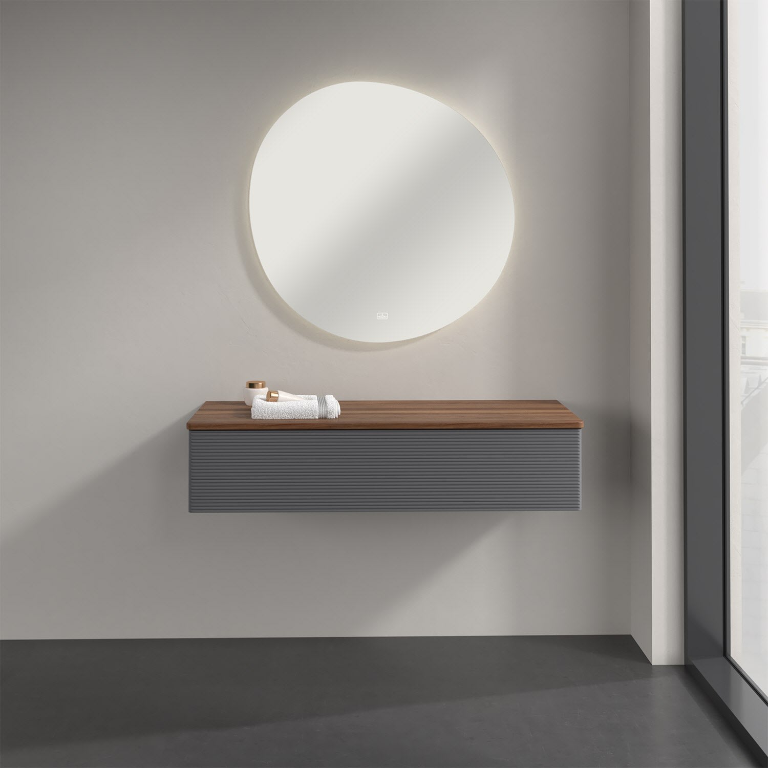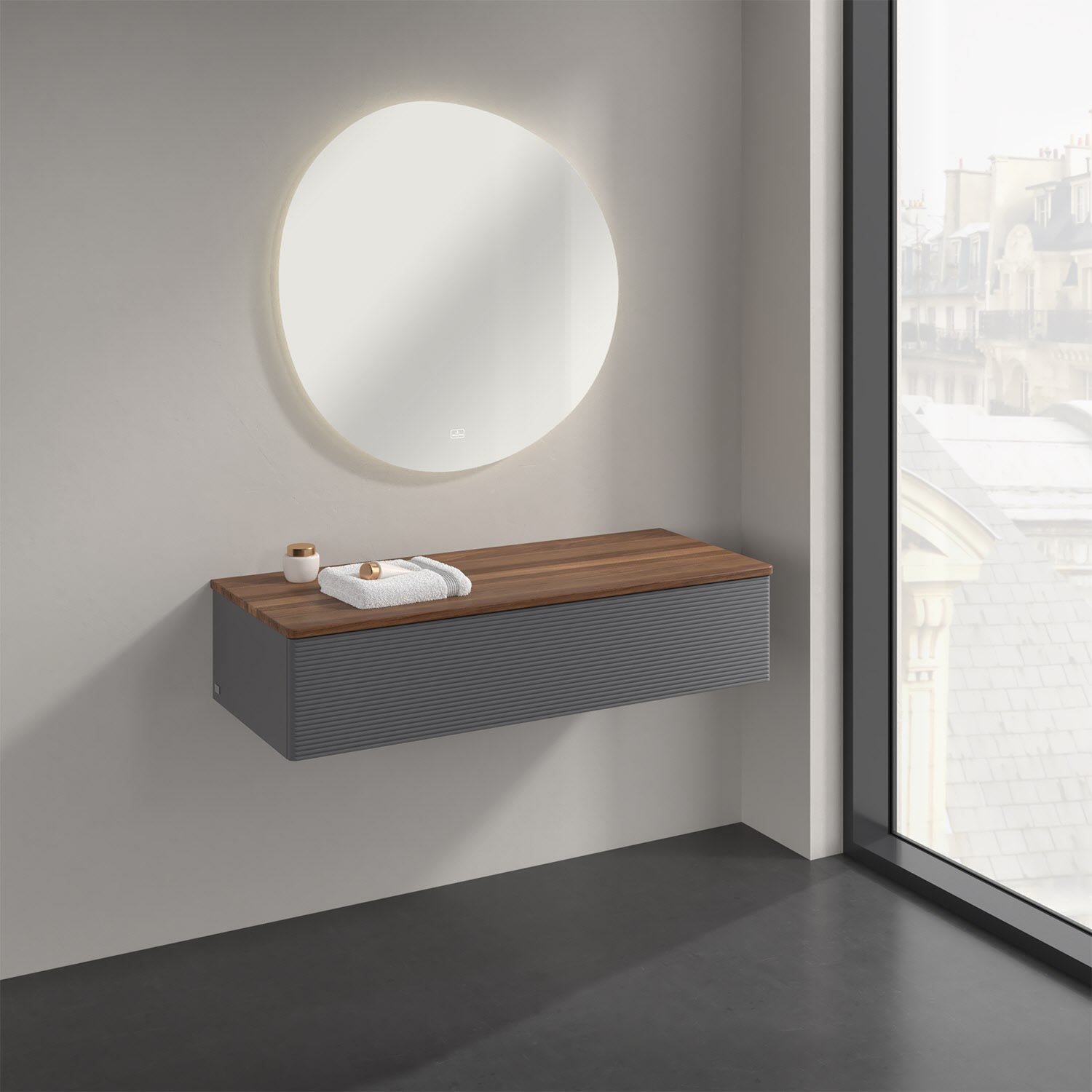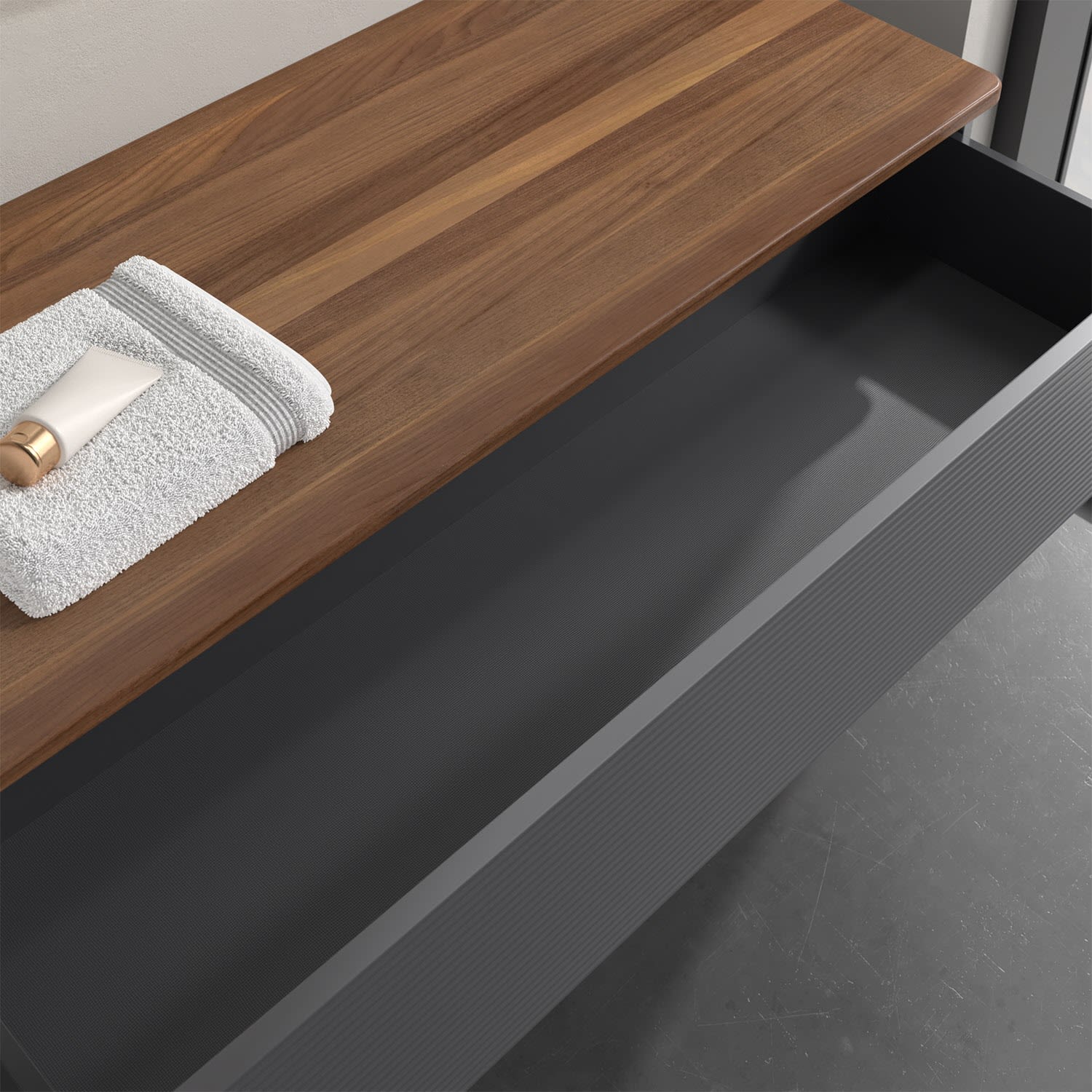 Ein hochwertiges Badmöbel von Villeroy & Boch mit sanfter Formsprache durch abgerundete Kanten: Das wandhängende Sideboard der Kollektion Antao bietet eine ideale Stauraummöglichkeit im Badezimmer und ist auch optisch ein Blickfang. Es verfügt über einen grifflosen Auszug mit strukturierter Front und Push-to-Open Funktion. Er lässt sich in seiner vollen Tiefe öffnen und ermöglicht so großzügigen Stauraum für diverse Utensilien, über die man nicht den Überblick verliert. Der integrierte Antirutschboden sorgt dabei dafür, dass der Inhalt sicher und fest steht. Handtücher oder auch Dekoartikel finden auf der Ablagefläche bequem ihren Platz. Für eine besonders leichte Pflege sorgt die mehrschichtig deckend lackierte Oberfläche. Bei der Ausführung in Massivholz wird dank des verarbeiteten Massivholzes jedes Möbel zu einem Unikat, das sich durch das lebendige Naturmaterial durch seine einzigartige Struktur und Maserung auszeichnet.