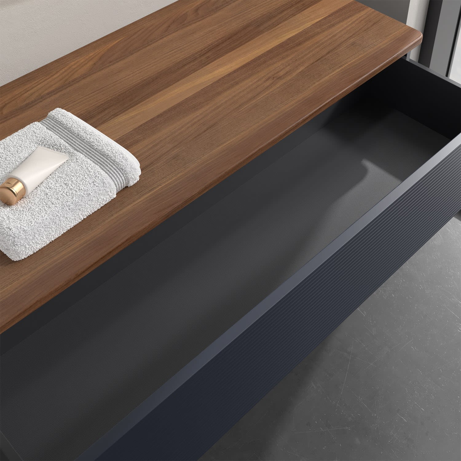 - kein Umfallen oder Verrutschen von Pflegeprodukten in den Schubladen dank rutschhemmendem Boden