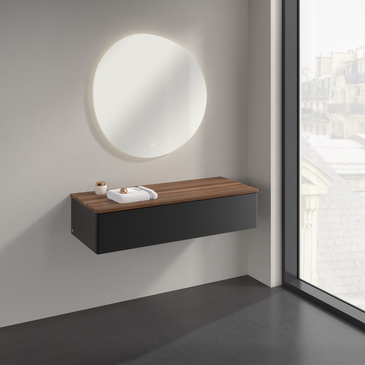 Ein hochwertiges Badmöbel von Villeroy & Boch mit sanfter Formsprache durch abgerundete Kanten: Das wandhängende Sideboard der Kollektion Antao bietet eine ideale Stauraummöglichkeit im Badezimmer und ist auch optisch ein Blickfang. Es verfügt über einen grifflosen Auszug mit strukturierter Front und Push-to-Open Funktion. Er lässt sich in seiner vollen Tiefe öffnen und ermöglicht so großzügigen Stauraum für diverse Utensilien, über die man nicht den Überblick verliert. Der integrierte Antirutschboden sorgt dabei dafür, dass der Inhalt sicher und fest steht. Handtücher oder auch Dekoartikel finden auf der Ablagefläche bequem ihren Platz. Für eine besonders leichte Pflege sorgt die mehrschichtig deckend lackierte Oberfläche. Bei der Ausführung in Massivholz wird dank des verarbeiteten Massivholzes jedes Möbel zu einem Unikat, das sich durch das lebendige Naturmaterial durch seine einzigartige Struktur und Maserung auszeichnet.