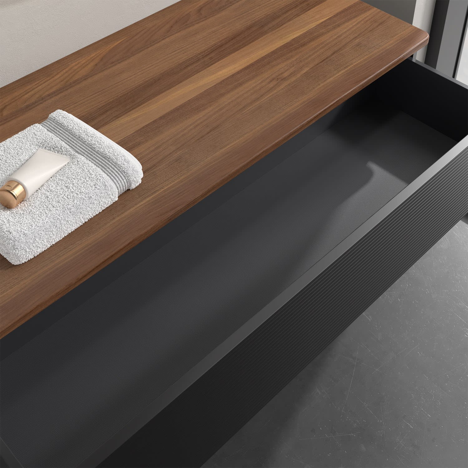 - kein Umfallen oder Verrutschen von Pflegeprodukten in den Schubladen dank rutschhemmendem Boden