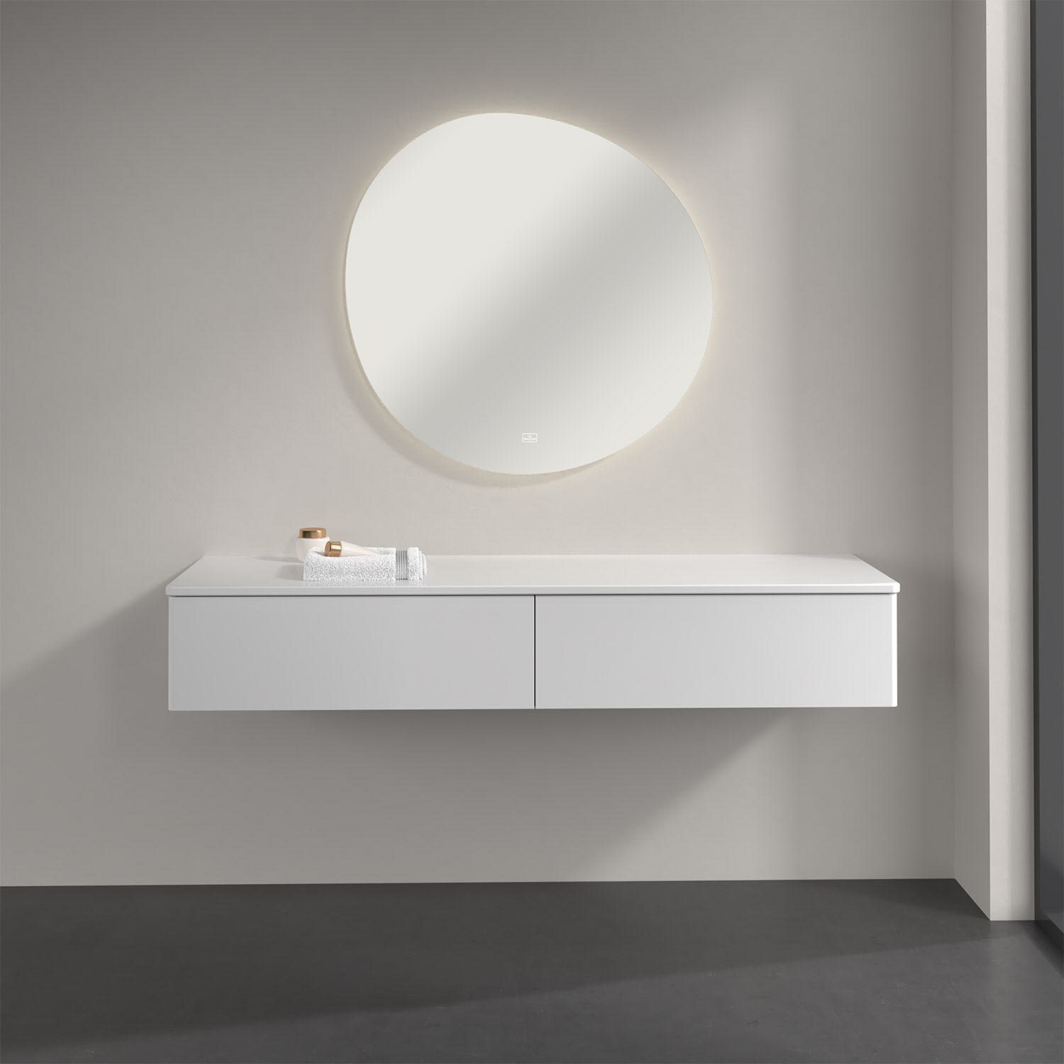 Ein hochwertiges Badmöbel von Villeroy & Boch mit sanfter Formsprache durch abgerundete Kanten: Das wandhängende Sideboard der Kollektion Antao bietet eine ideale Stauraummöglichkeit im Badezimmer und ist auch optisch ein Blickfang. Es verfügt über zwei grifflose Auszüge mit Push-to-Open Funktion. Sie lassen sich in ihrer vollen Tiefe öffnen und ermöglichen so großzügigen Stauraum für diverse Utensilien, über die man nicht den Überblick verliert. Der integrierte Antirutschboden sorgt dabei dafür, dass der Inhalt sicher und fest steht. Handtücher oder auch Dekoartikel lassen sich auf der großzügigen Ablagefläche bequem ablegen. Für eine besonders leichte Pflege sorgt die mehrschichtig deckend lackierte Oberfläche.