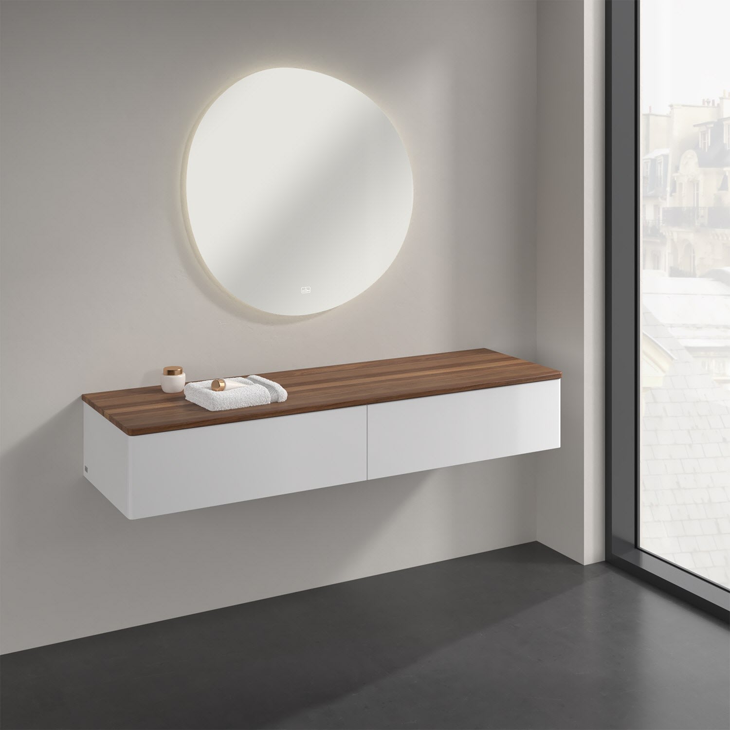 Ein hochwertiges Badmöbel von Villeroy & Boch mit sanfter Formsprache durch abgerundete Kanten: Das wandhängende Sideboard der Kollektion Antao bietet eine ideale Stauraummöglichkeit im Badezimmer und ist auch optisch ein Blickfang. Es verfügt über zwei grifflose Auszüge mit Push-to-Open Funktion. Sie lassen sich in ihrer vollen Tiefe öffnen und ermöglichen so großzügigen Stauraum für diverse Utensilien, über die man nicht den Überblick verliert. Der integrierte Antirutschboden sorgt dabei dafür, dass der Inhalt sicher und fest steht. Handtücher oder auch Dekoartikel lassen sich auf der großzügigen Ablagefläche bequem ablegen. Für eine besonders leichte Pflege sorgt die mehrschichtig deckend lackierte Oberfläche. Bei der Ausführung in Massivholz wird dank des verarbeiteten Massivholzes jedes Möbel zu einem Unikat, das sich durch das lebendige Naturmaterial durch seine einzigartige Struktur und Maserung auszeichnet.