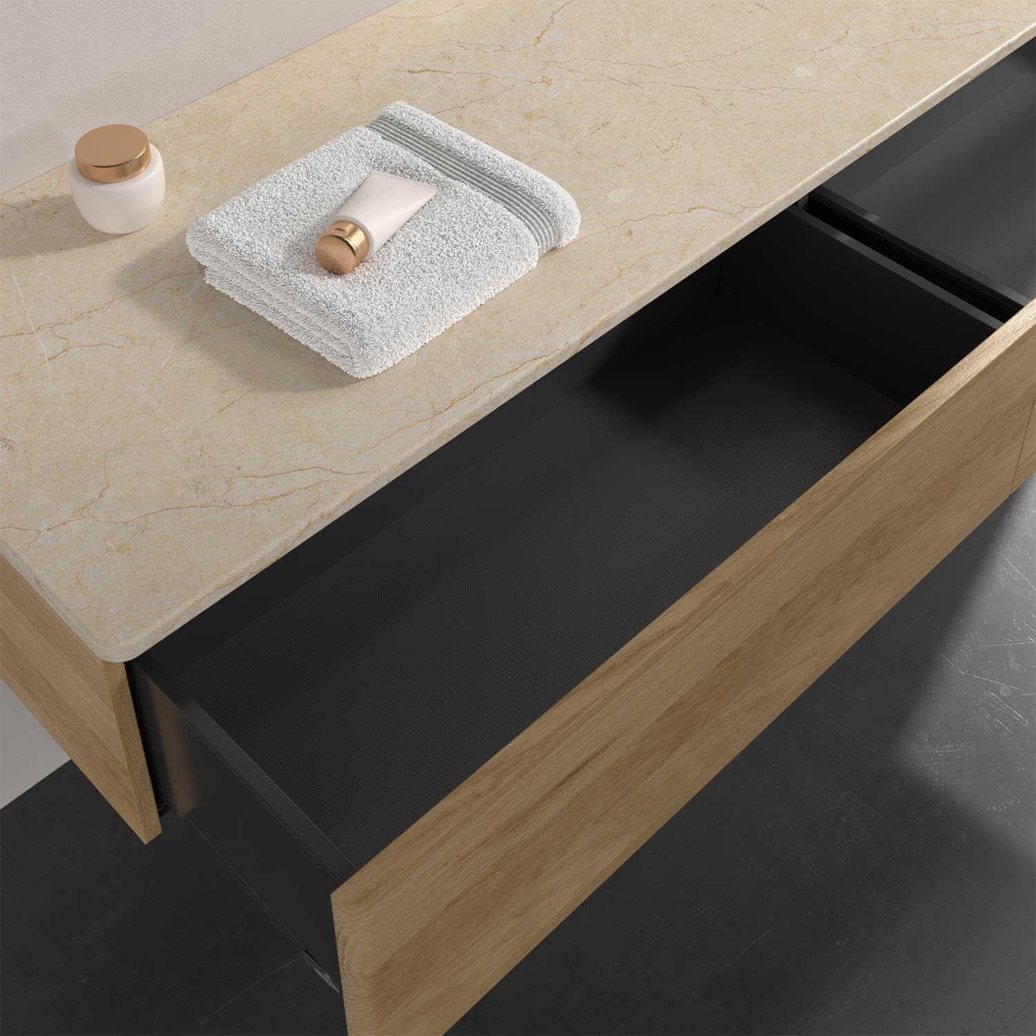 - kein Umfallen oder Verrutschen von Pflegeprodukten in den Schubladen dank rutschhemmendem Boden