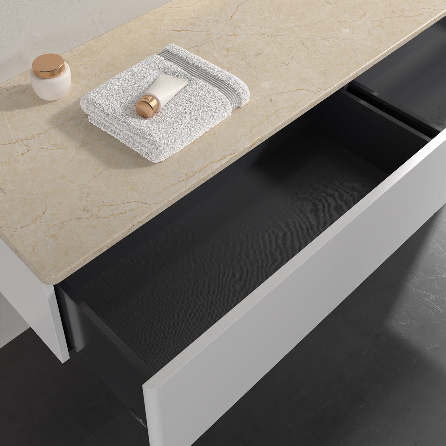 - kein Umfallen oder Verrutschen von Pflegeprodukten in den Schubladen dank rutschhemmendem Boden