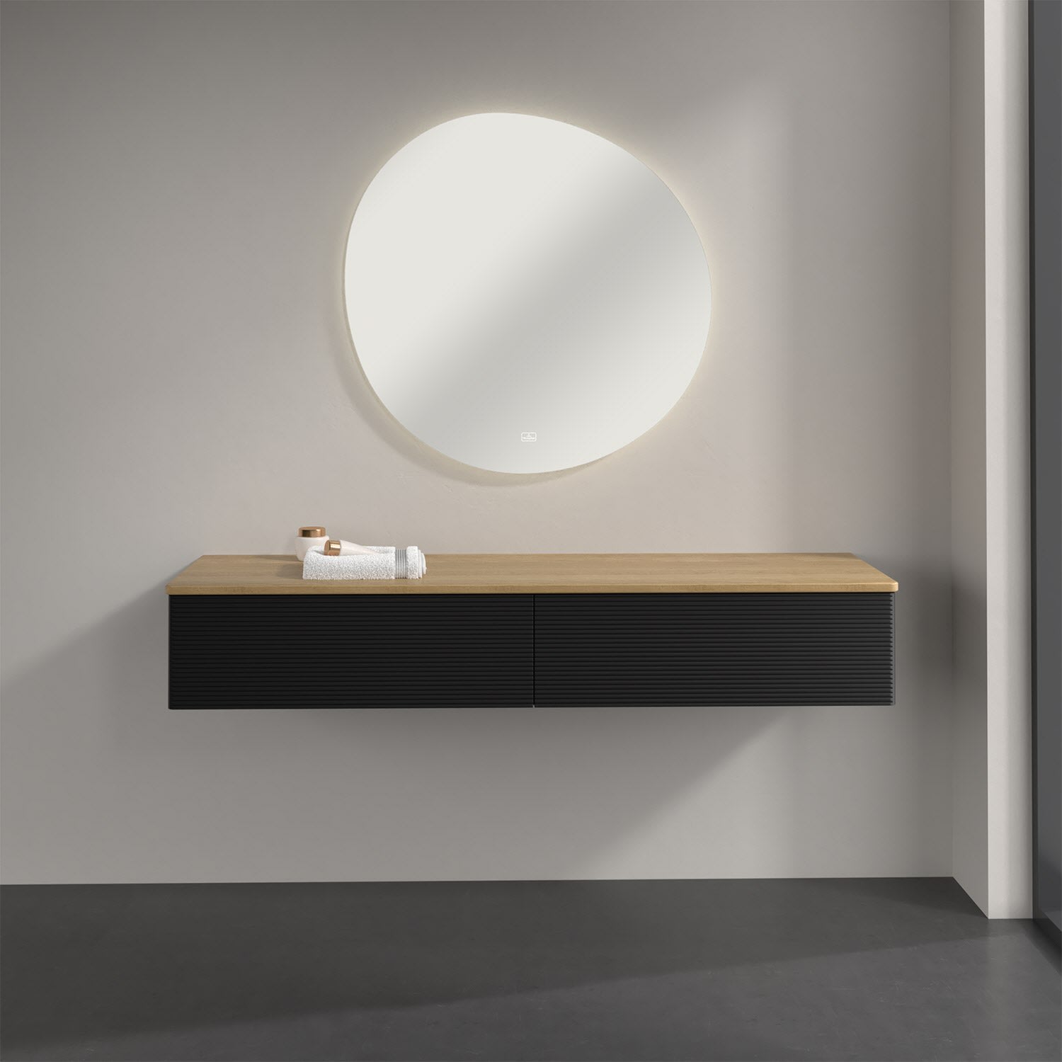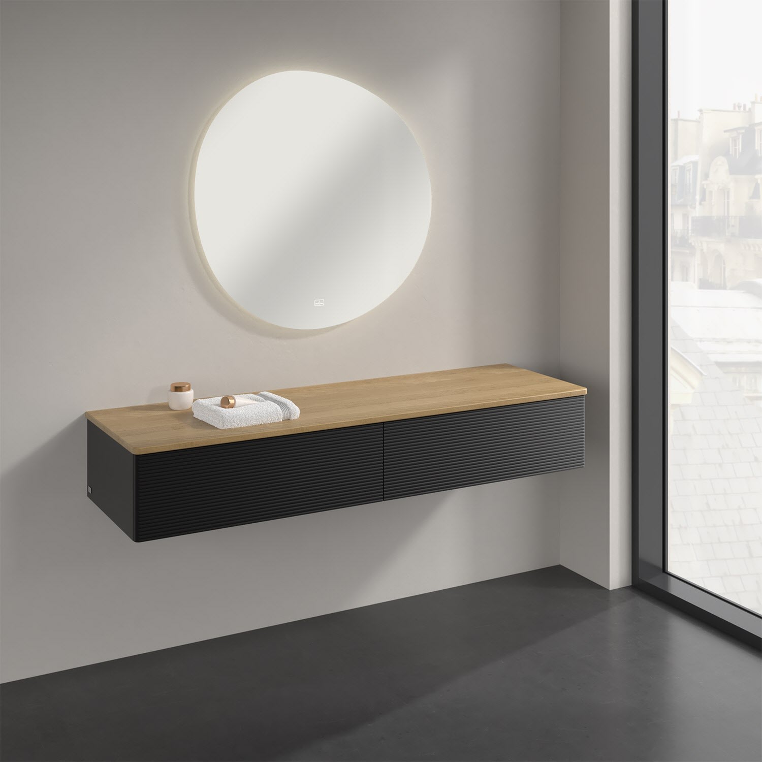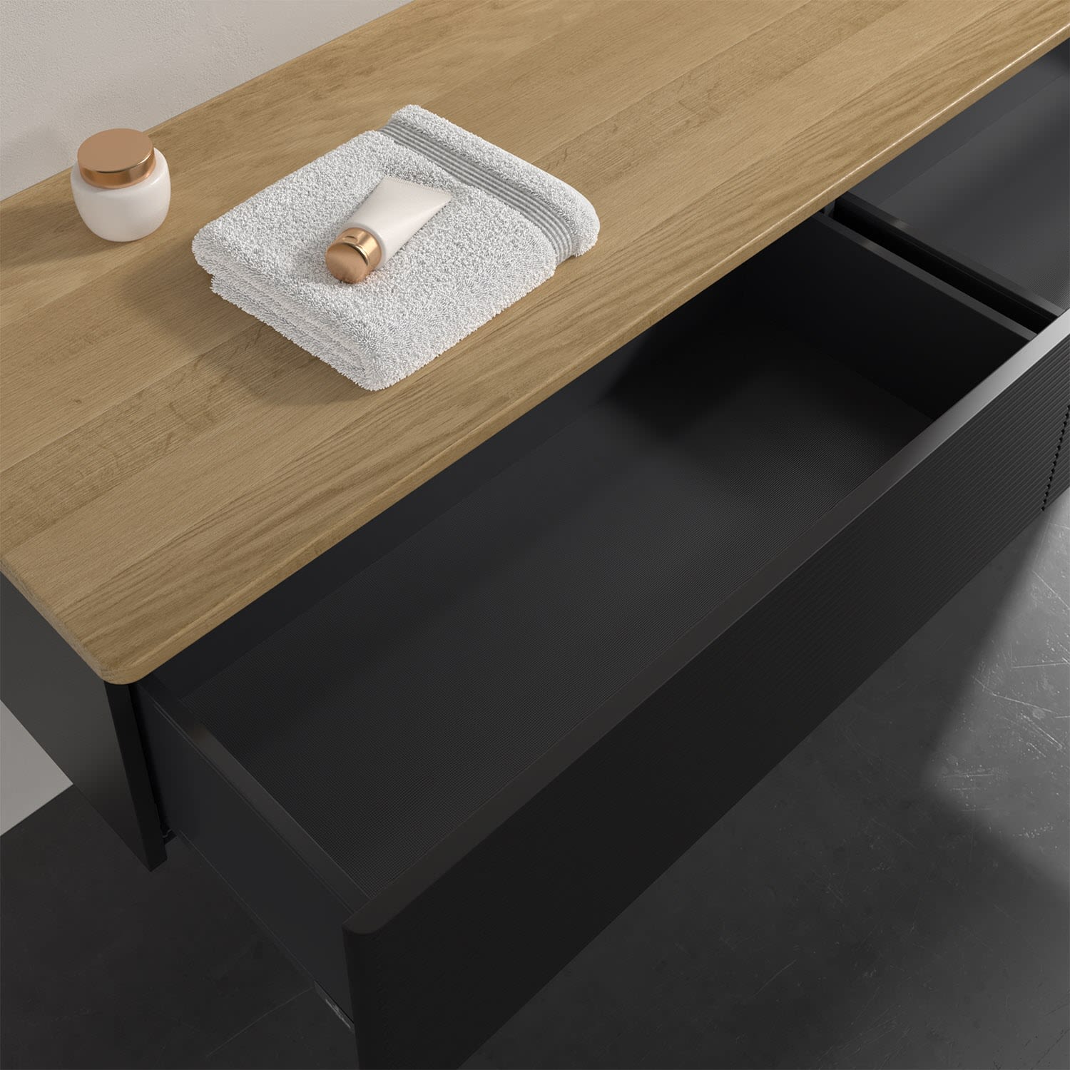 Ein hochwertiges Badmöbel von Villeroy & Boch mit sanfter Formsprache durch abgerundete Kanten: Das wandhängende Sideboard der Kollektion Antao bietet eine ideale Stauraummöglichkeit im Badezimmer und ist auch optisch ein Blickfang. Es verfügt über zwei grifflose Auszüge mit strukturierten Fronten und Push-to-Open Funktion. Sie lassen sich in ihrer vollen Tiefe öffnen und ermöglichen so großzügigen Stauraum für diverse Utensilien, über die man nicht den Überblick verliert. Der integrierte Antirutschboden sorgt dabei dafür, dass der Inhalt sicher und fest steht. Handtücher oder auch Dekoartikel lassen sich auf der großzügigen Ablagefläche bequem ablegen. Für eine besonders leichte Pflege sorgt die mehrschichtig deckend lackierte Oberfläche. Bei der Ausführung in Massivholz wird dank des verarbeiteten Massivholzes jedes Möbel zu einem Unikat, das sich durch das lebendige Naturmaterial durch seine einzigartige Struktur und Maserung auszeichnet.