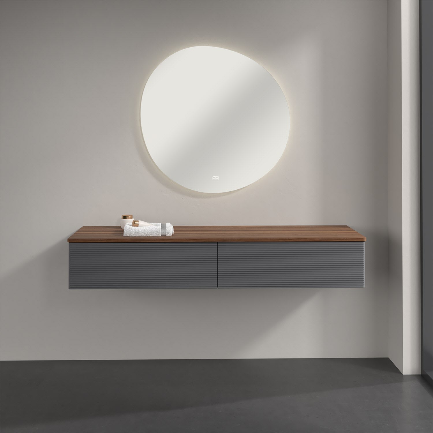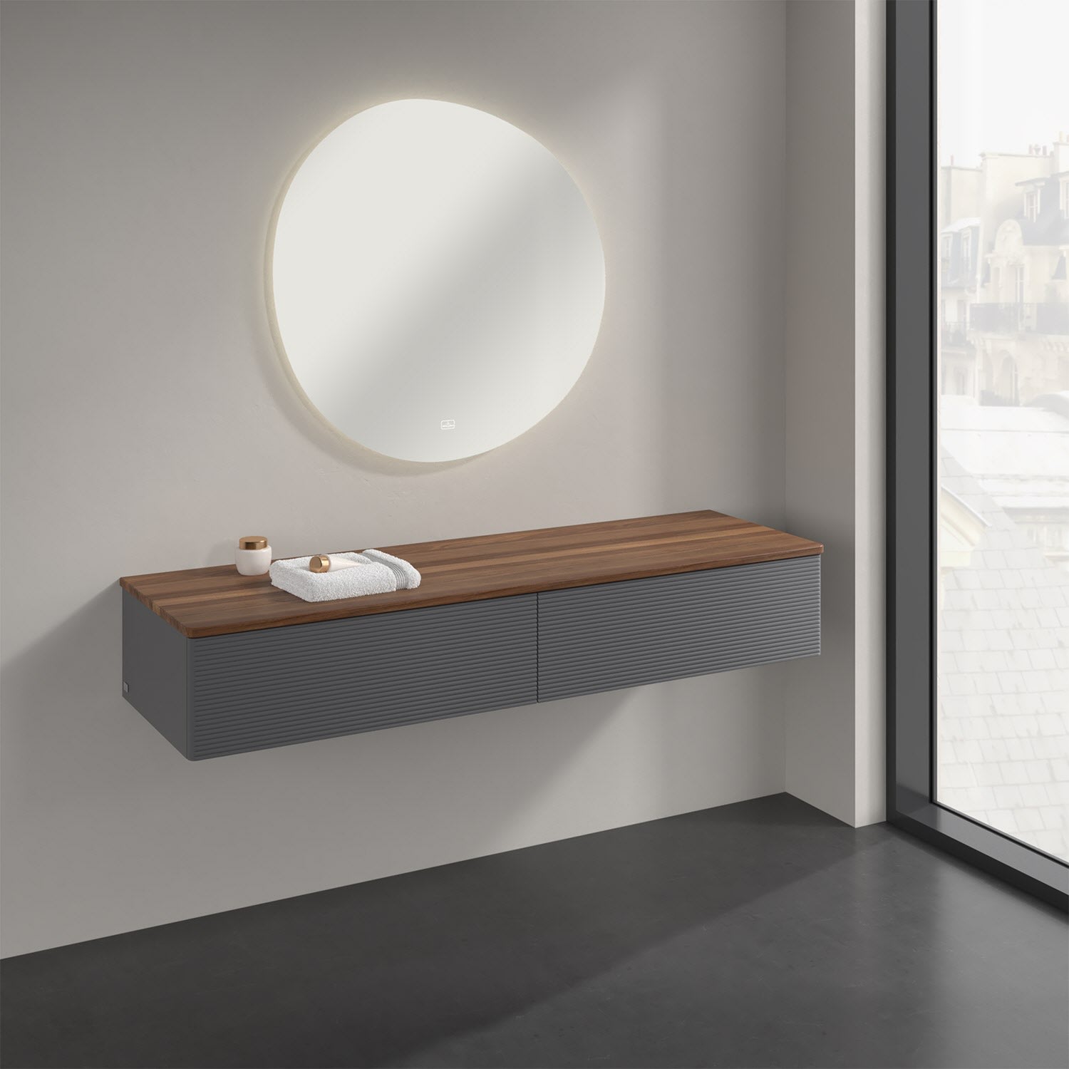Ein hochwertiges Badmöbel von Villeroy & Boch mit sanfter Formsprache durch abgerundete Kanten: Das wandhängende Sideboard der Kollektion Antao bietet eine ideale Stauraummöglichkeit im Badezimmer und ist auch optisch ein Blickfang. Es verfügt über zwei grifflose Auszüge mit strukturierten Fronten und Push-to-Open Funktion. Sie lassen sich in ihrer vollen Tiefe öffnen und ermöglichen so großzügigen Stauraum für diverse Utensilien, über die man nicht den Überblick verliert. Der integrierte Antirutschboden sorgt dabei dafür, dass der Inhalt sicher und fest steht. Handtücher oder auch Dekoartikel lassen sich auf der großzügigen Ablagefläche bequem ablegen. Für eine besonders leichte Pflege sorgt die mehrschichtig deckend lackierte Oberfläche. Bei der Ausführung in Massivholz wird dank des verarbeiteten Massivholzes jedes Möbel zu einem Unikat, das sich durch das lebendige Naturmaterial durch seine einzigartige Struktur und Maserung auszeichnet.