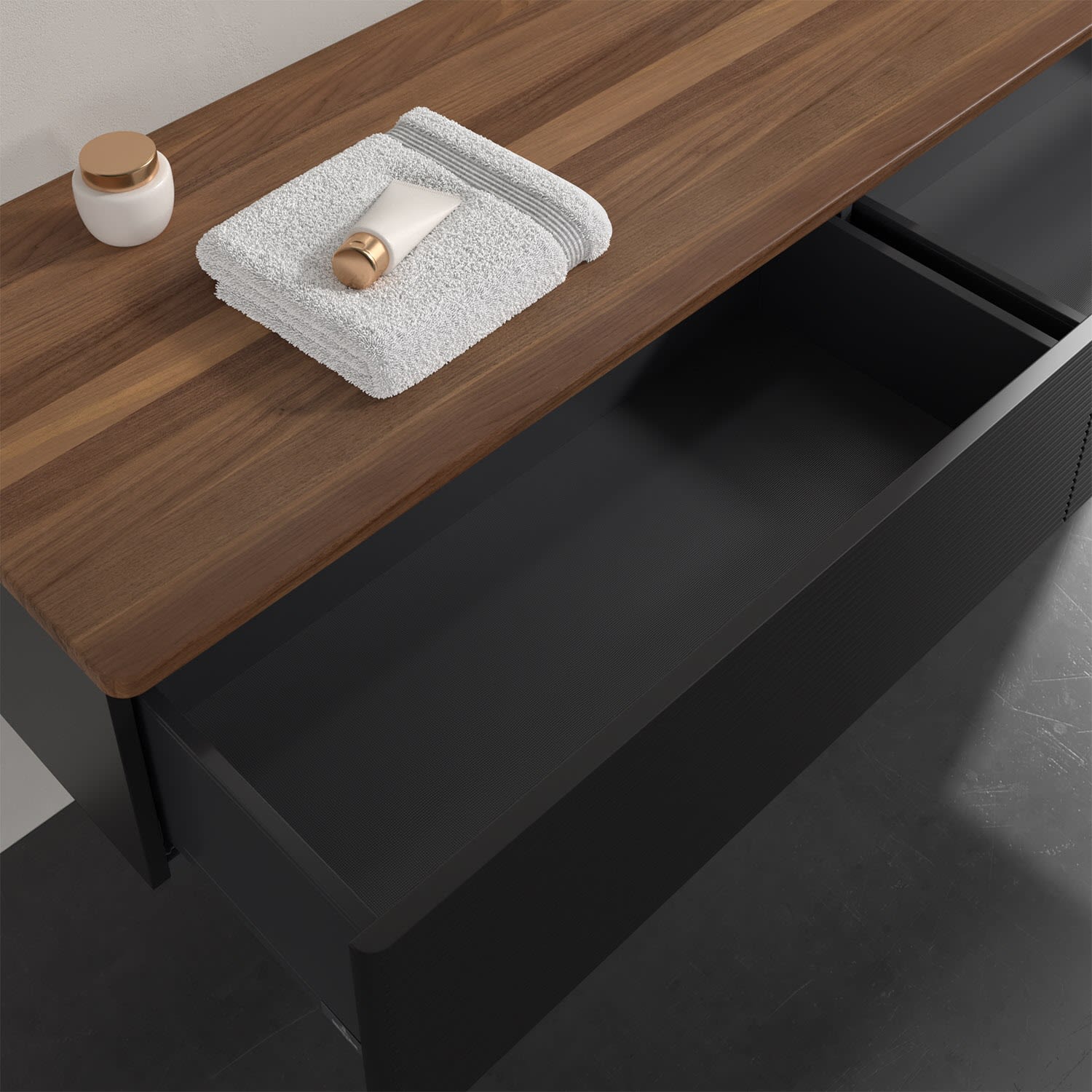 - kein Umfallen oder Verrutschen von Pflegeprodukten in den Schubladen dank rutschhemmendem Boden
