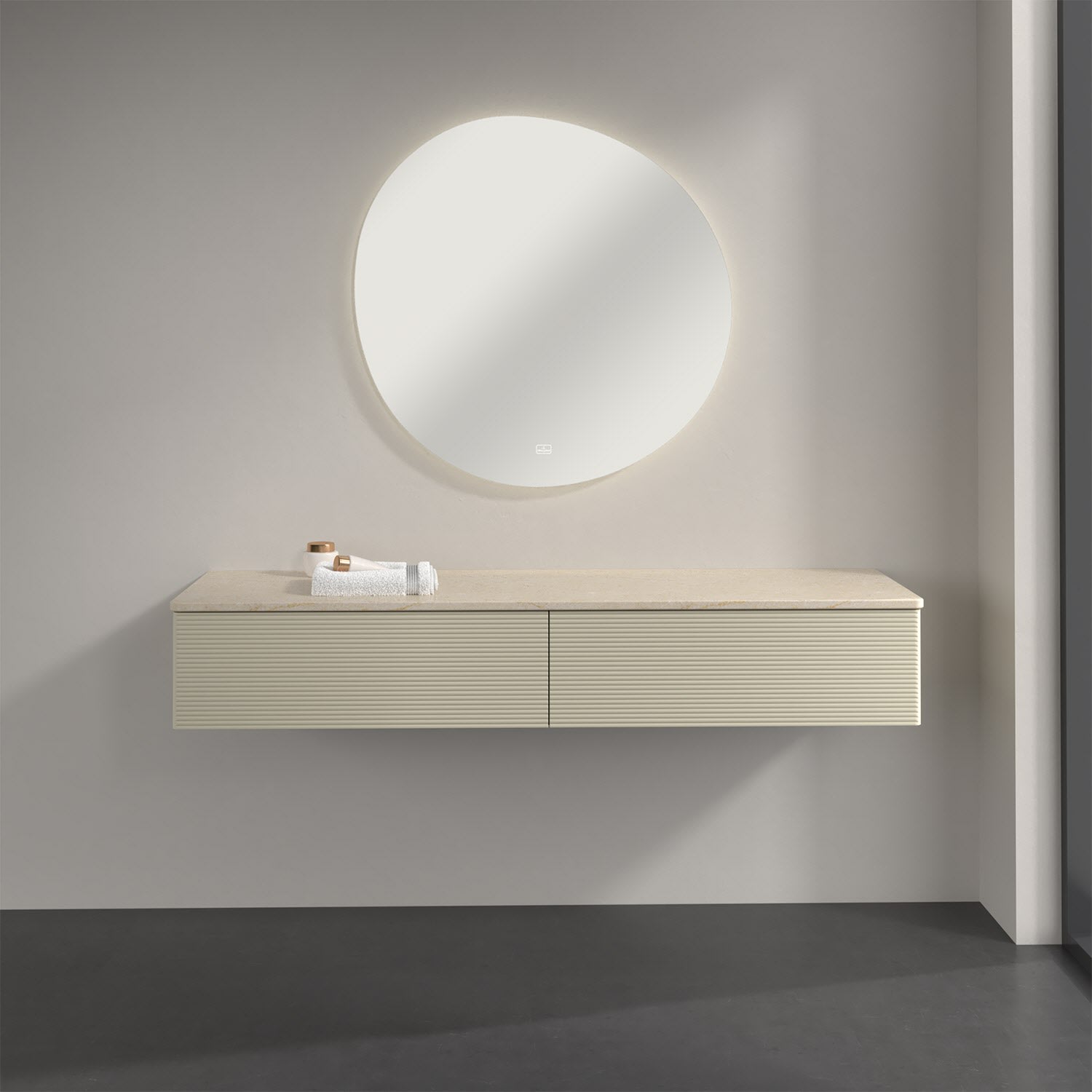 Ein hochwertiges Badmöbel von Villeroy & Boch mit sanfter Formsprache durch abgerundete Kanten: Das wandhängende Sideboard der Kollektion Antao bietet eine ideale Stauraummöglichkeit im Badezimmer und ist auch optisch ein Blickfang. Es verfügt über zwei grifflose Auszüge mit strukturierten Fronten und Push-to-Open Funktion. Sie lassen sich in ihrer vollen Tiefe öffnen und ermöglichen so großzügigen Stauraum für diverse Utensilien, über die man nicht den Überblick verliert. Der integrierte Antirutschboden sorgt dabei dafür, dass der Inhalt sicher und fest steht. Handtücher oder auch Dekoartikel lassen sich auf der großzügigen Ablagefläche bequem ablegen. Für eine besonders leichte Pflege sorgt die mehrschichtig deckend lackierte Oberfläche. Bei der Ausführung in Massivholz wird dank des verarbeiteten Massivholzes jedes Möbel zu einem Unikat, das sich durch das lebendige Naturmaterial durch seine einzigartige Struktur und Maserung auszeichnet.