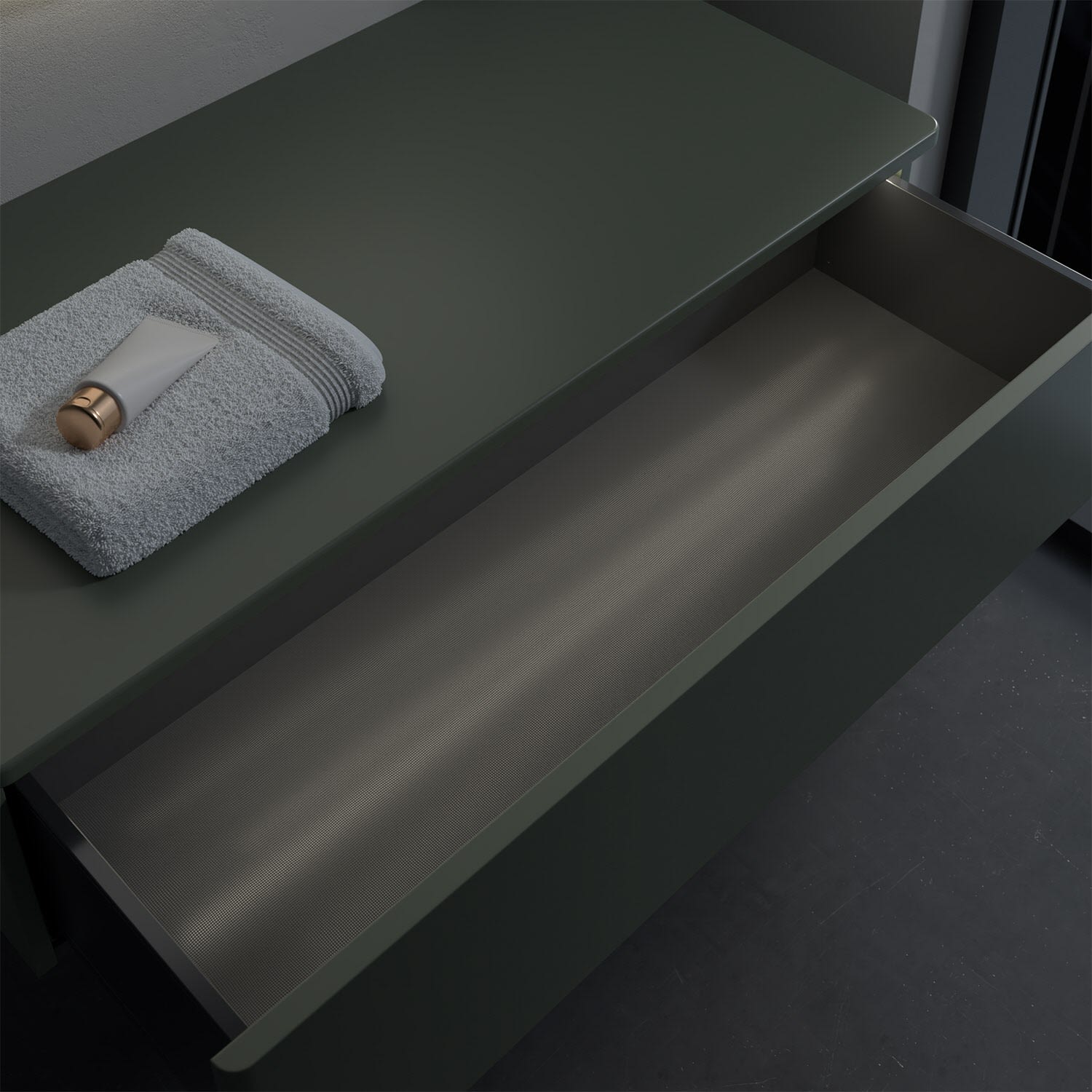 - kein Umfallen oder Verrutschen von Pflegeprodukten in den Schubladen dank rutschhemmendem Boden