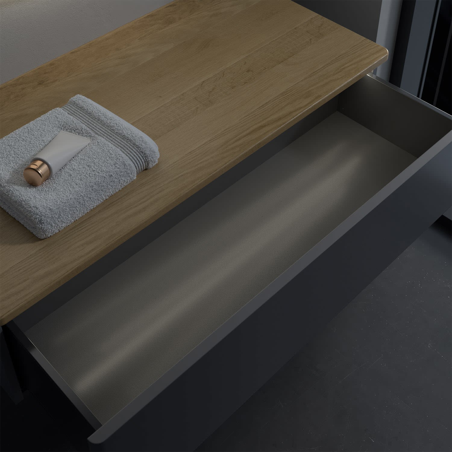 - kein Umfallen oder Verrutschen von Pflegeprodukten in den Schubladen dank rutschhemmendem Boden