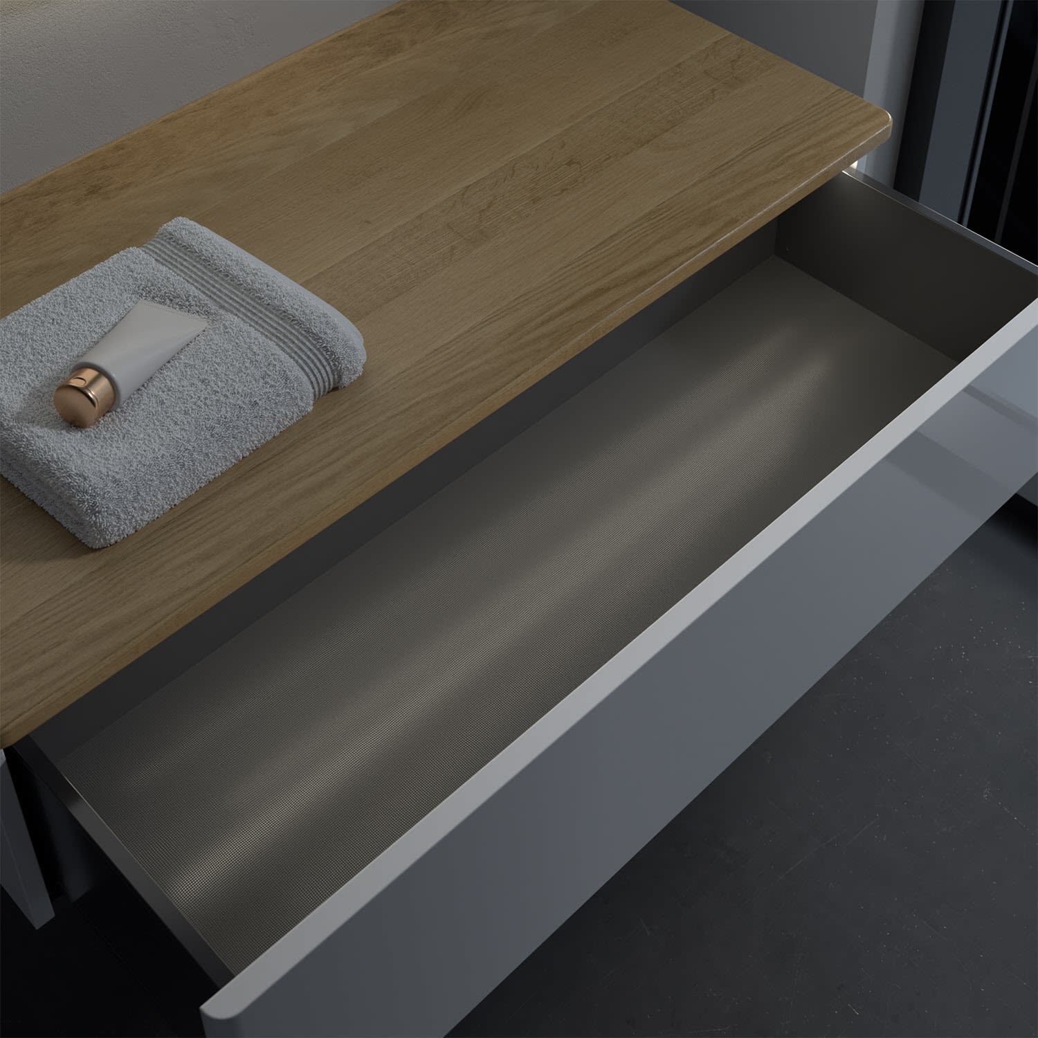 - kein Umfallen oder Verrutschen von Pflegeprodukten in den Schubladen dank rutschhemmendem Boden