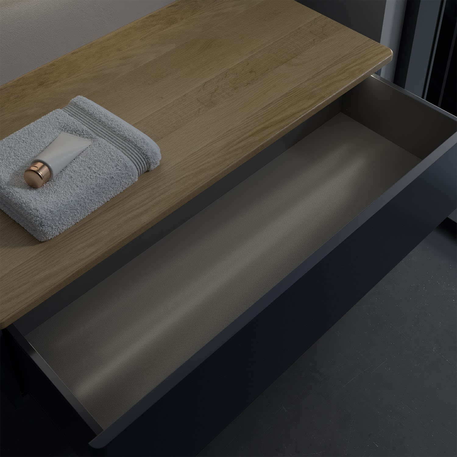 - kein Umfallen oder Verrutschen von Pflegeprodukten in den Schubladen dank rutschhemmendem Boden
