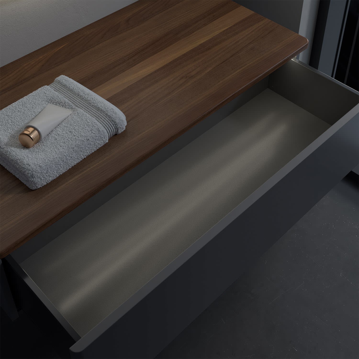 - kein Umfallen oder Verrutschen von Pflegeprodukten in den Schubladen dank rutschhemmendem Boden