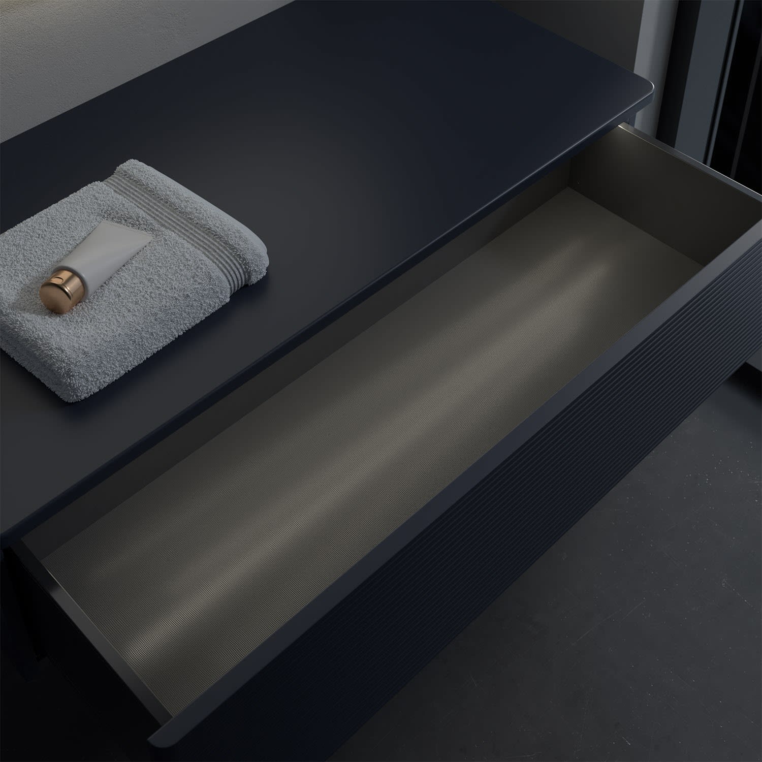 - kein Umfallen oder Verrutschen von Pflegeprodukten in den Schubladen dank rutschhemmendem Boden